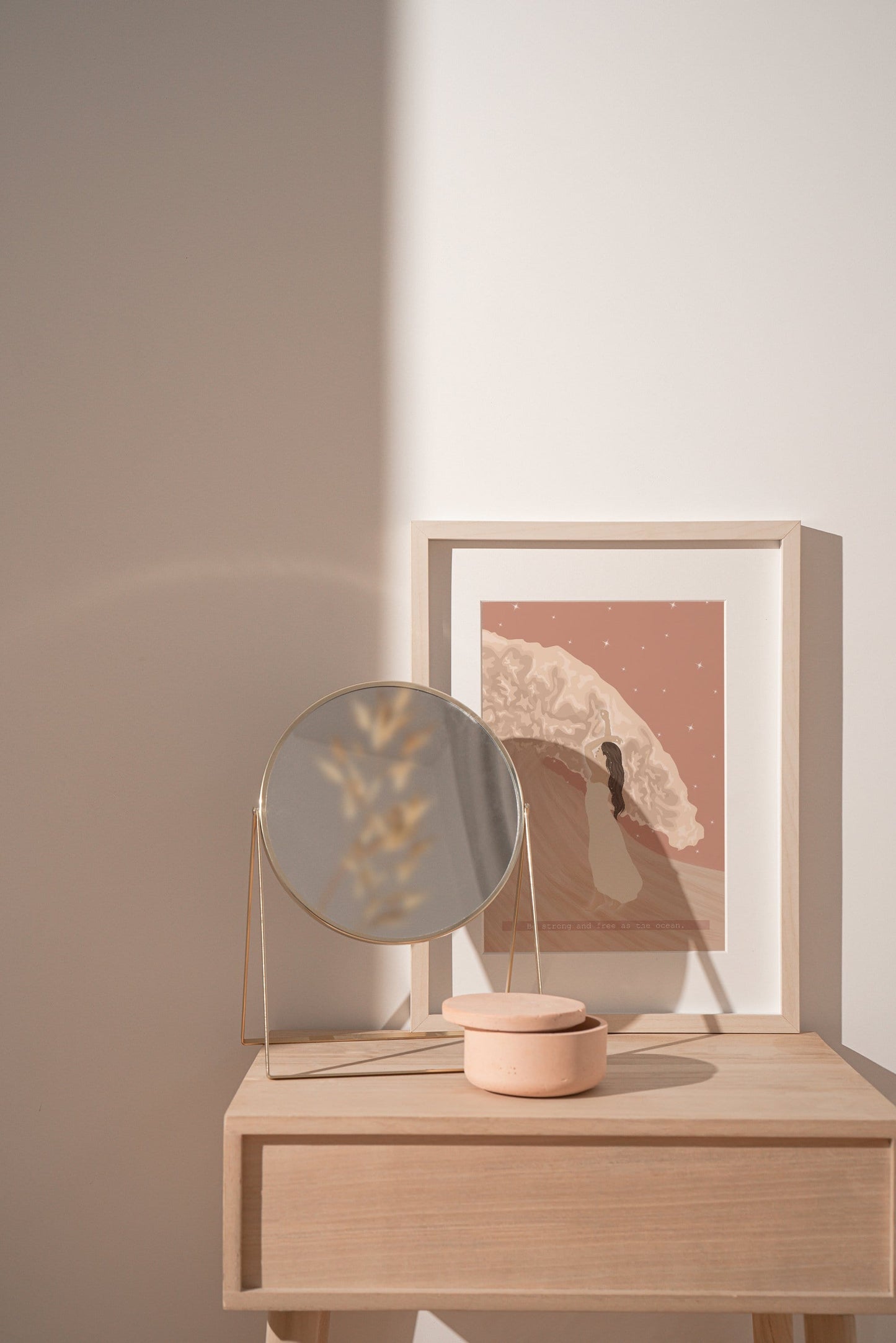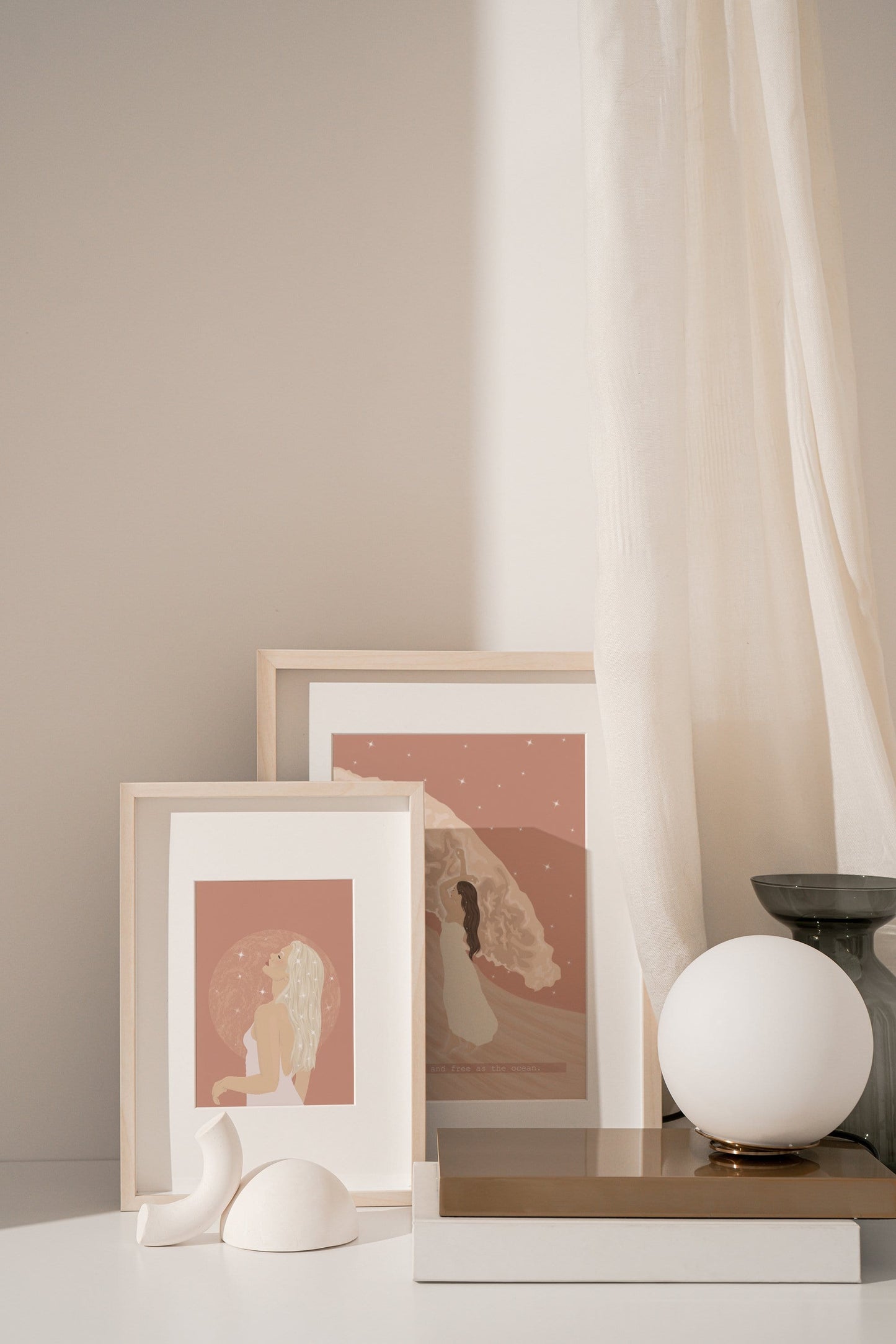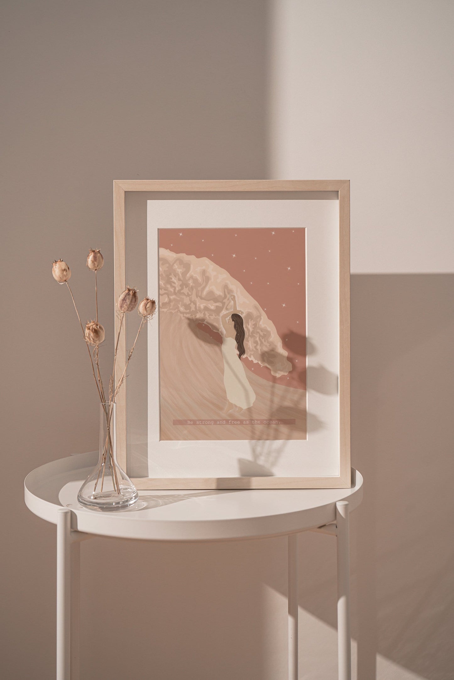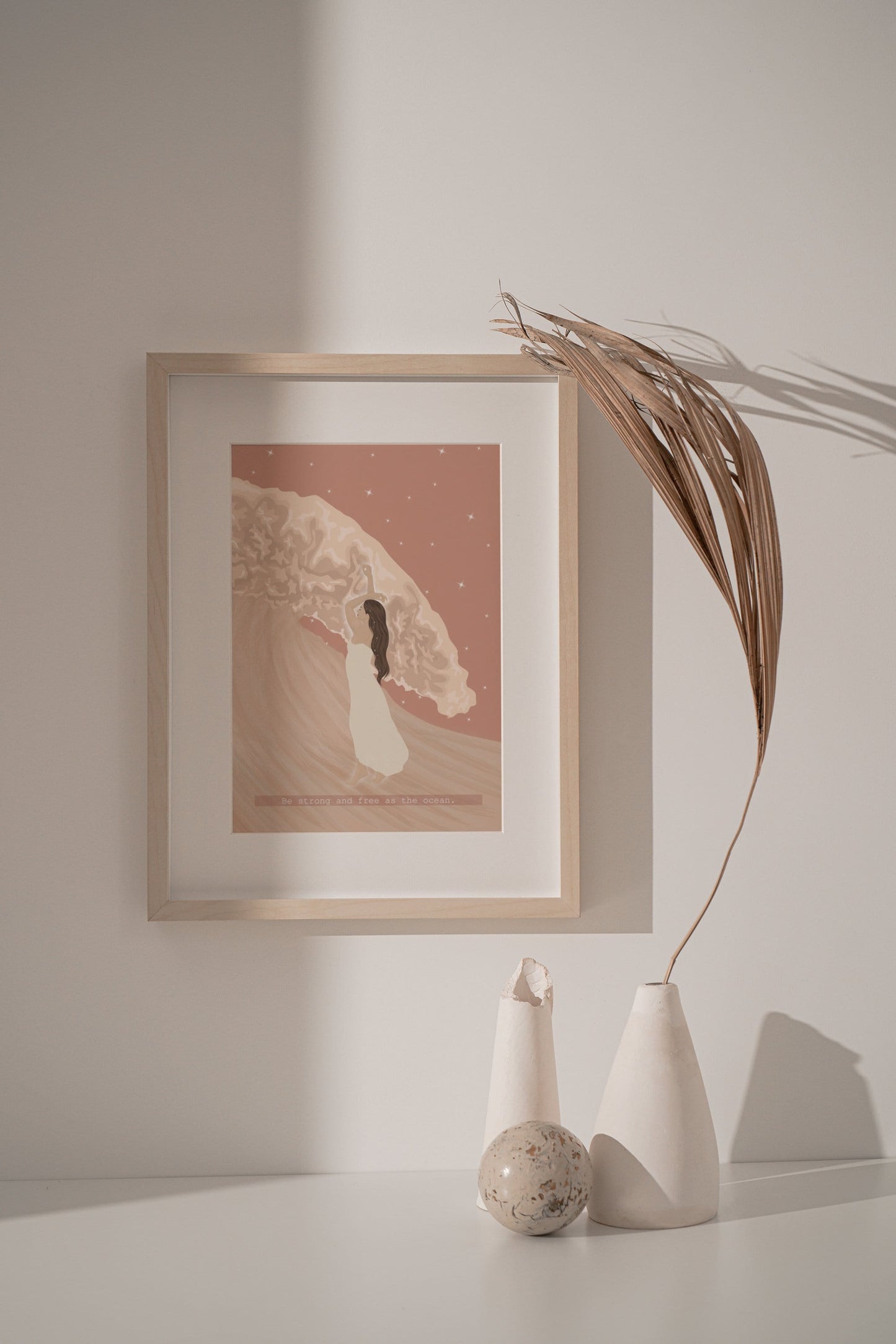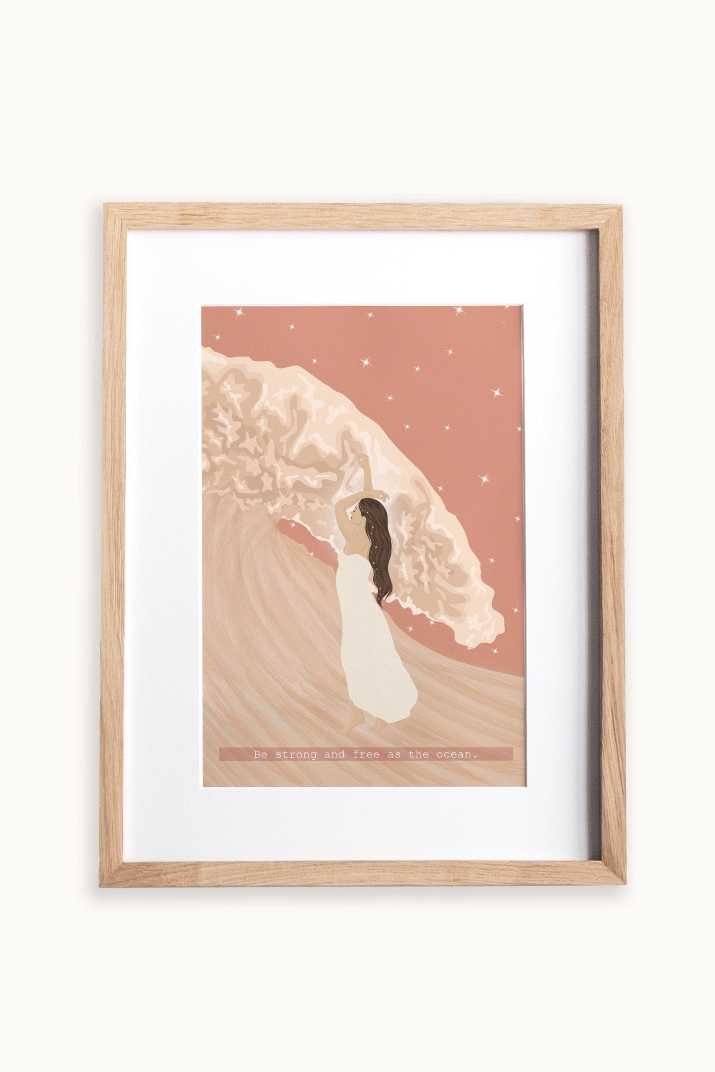 Spiritual and celestial illustration of a woman in the ocean and the quote "Be strong and free as the ocean" to let you embrace the divine feeling of connection with nature and especially with the ocean.