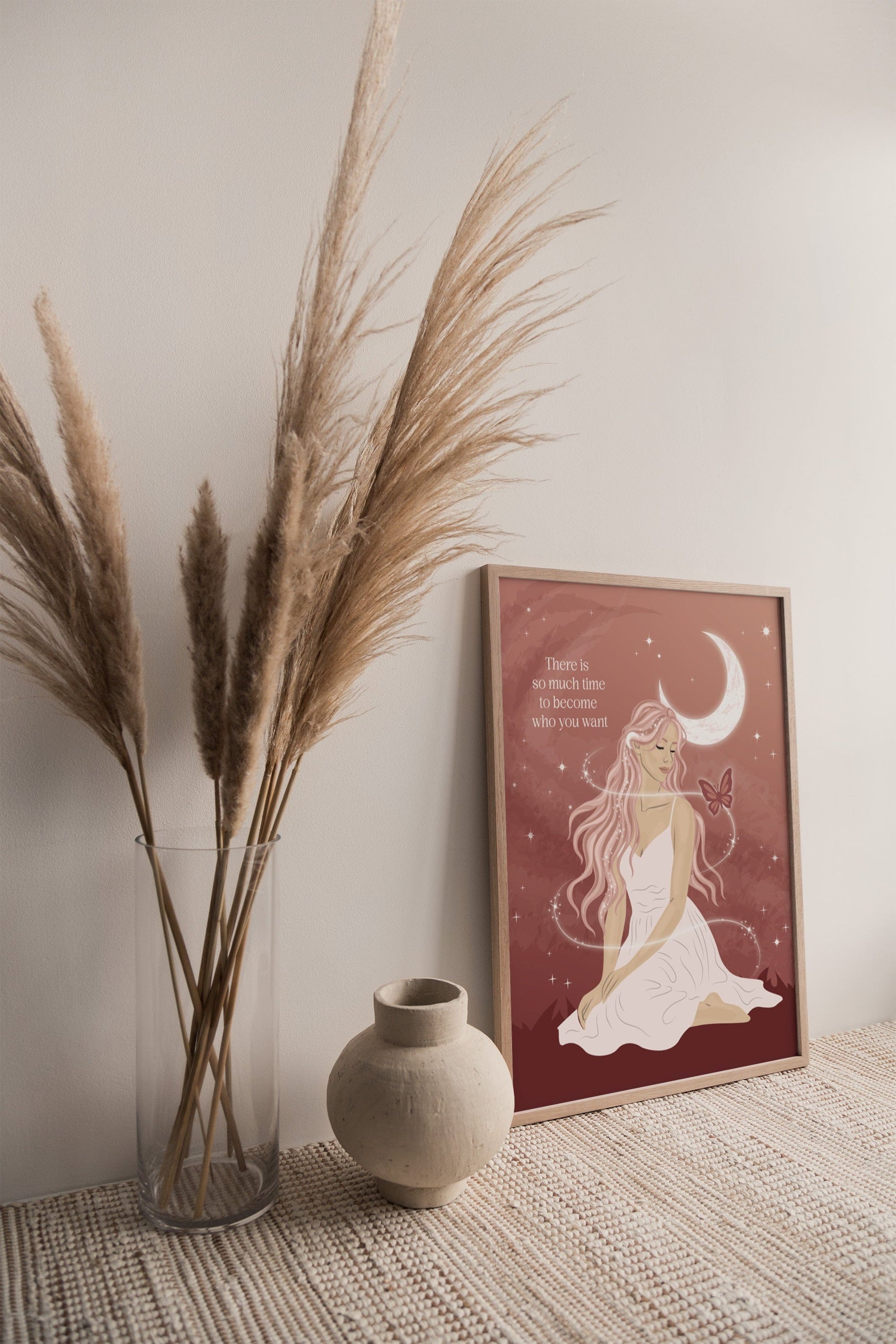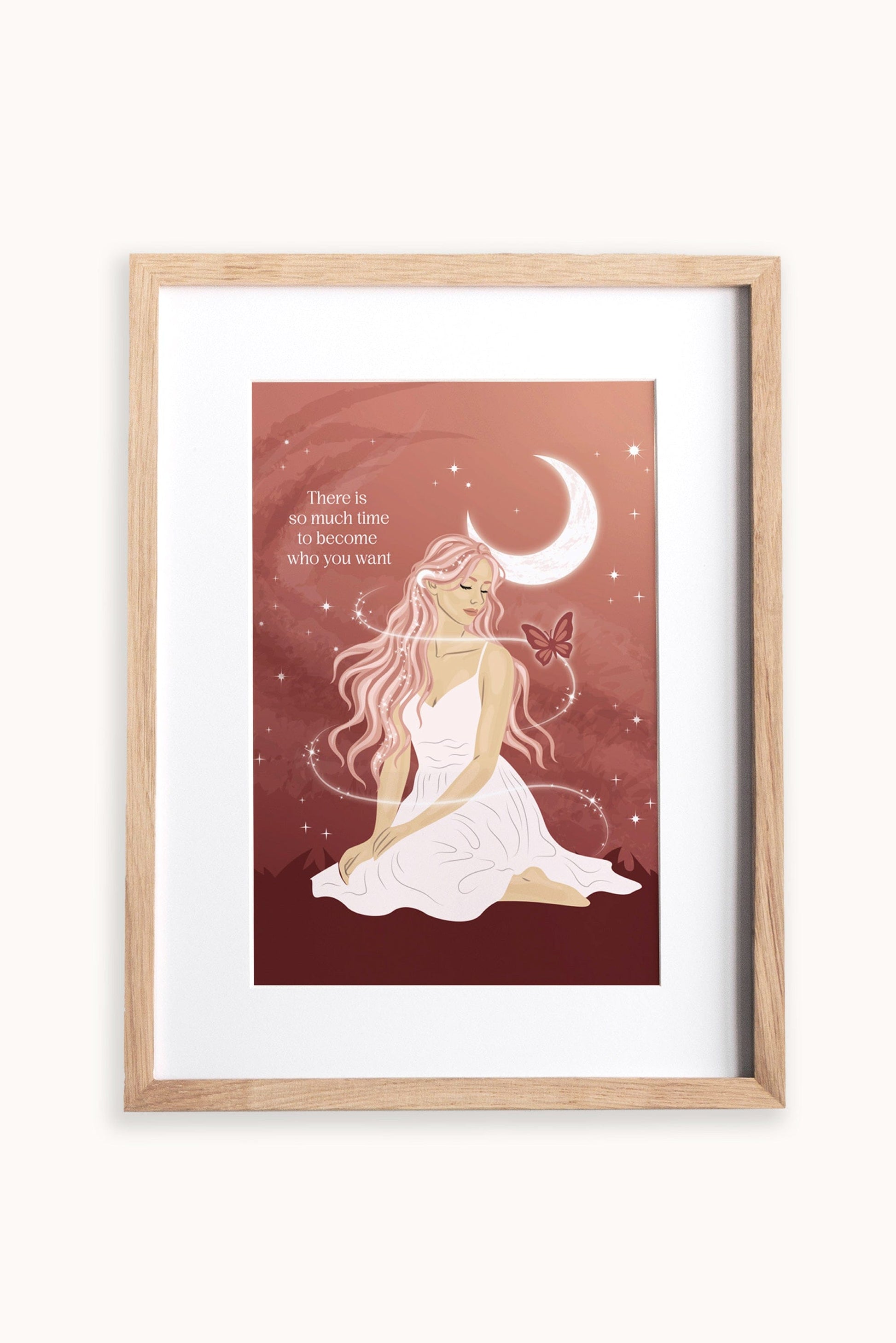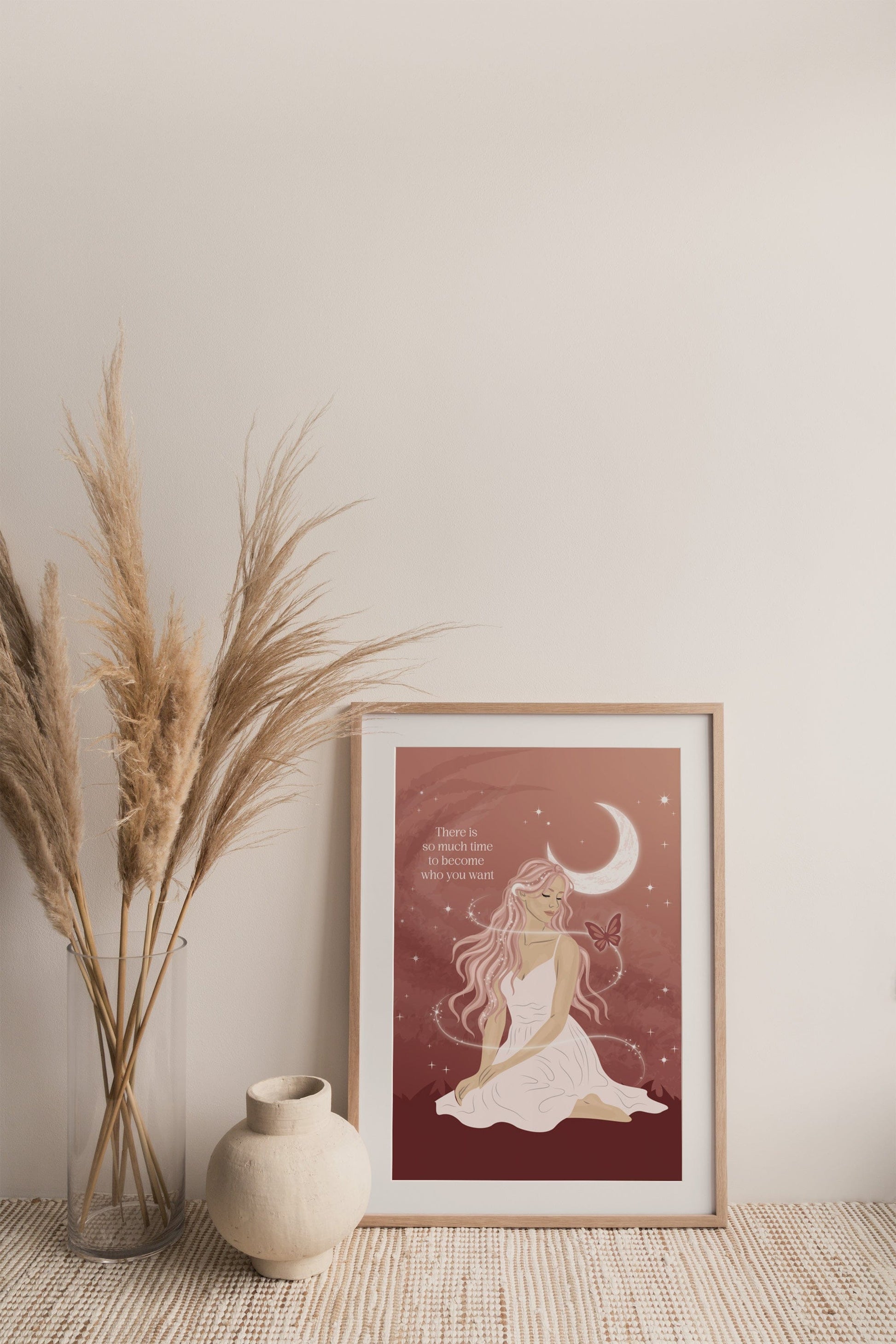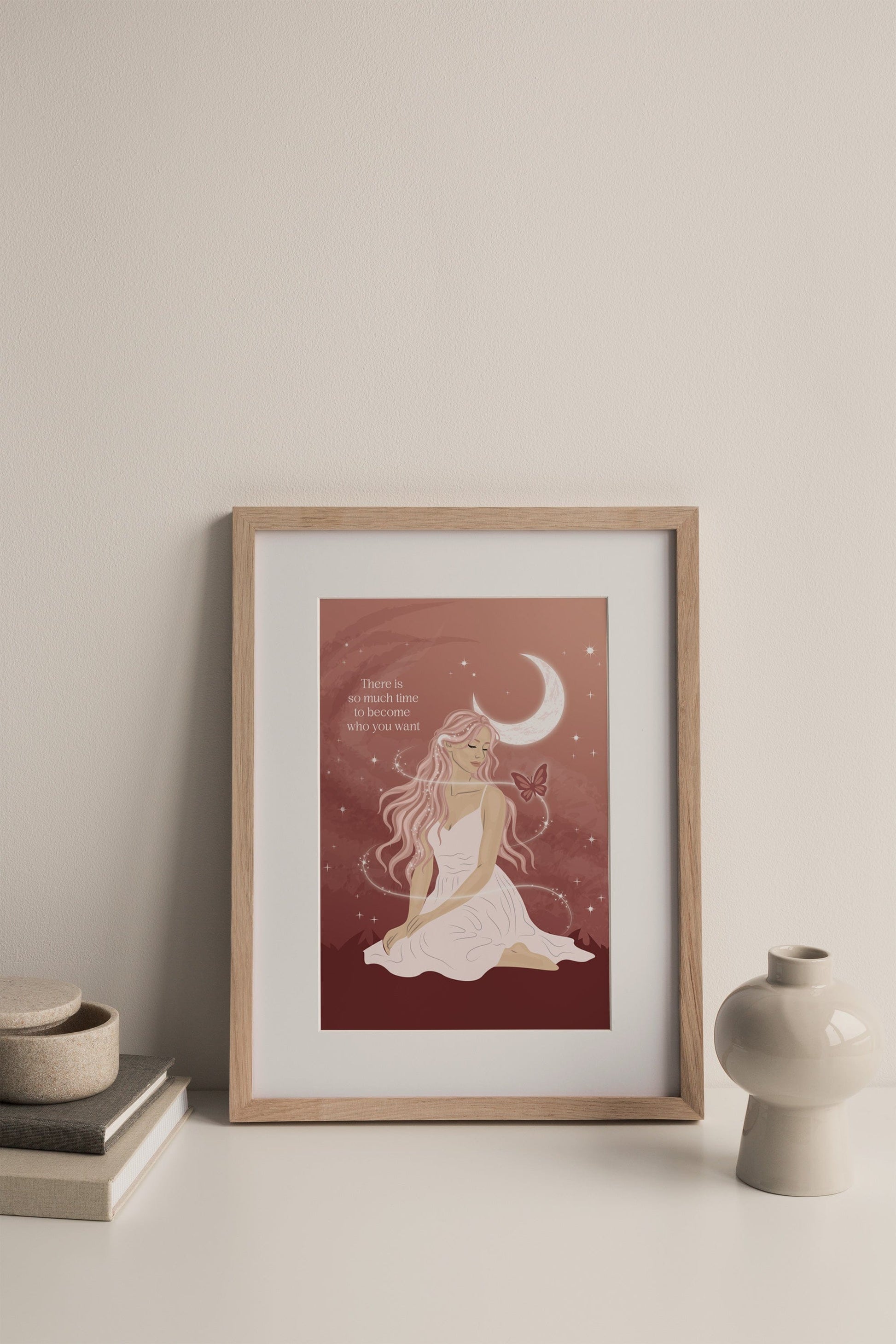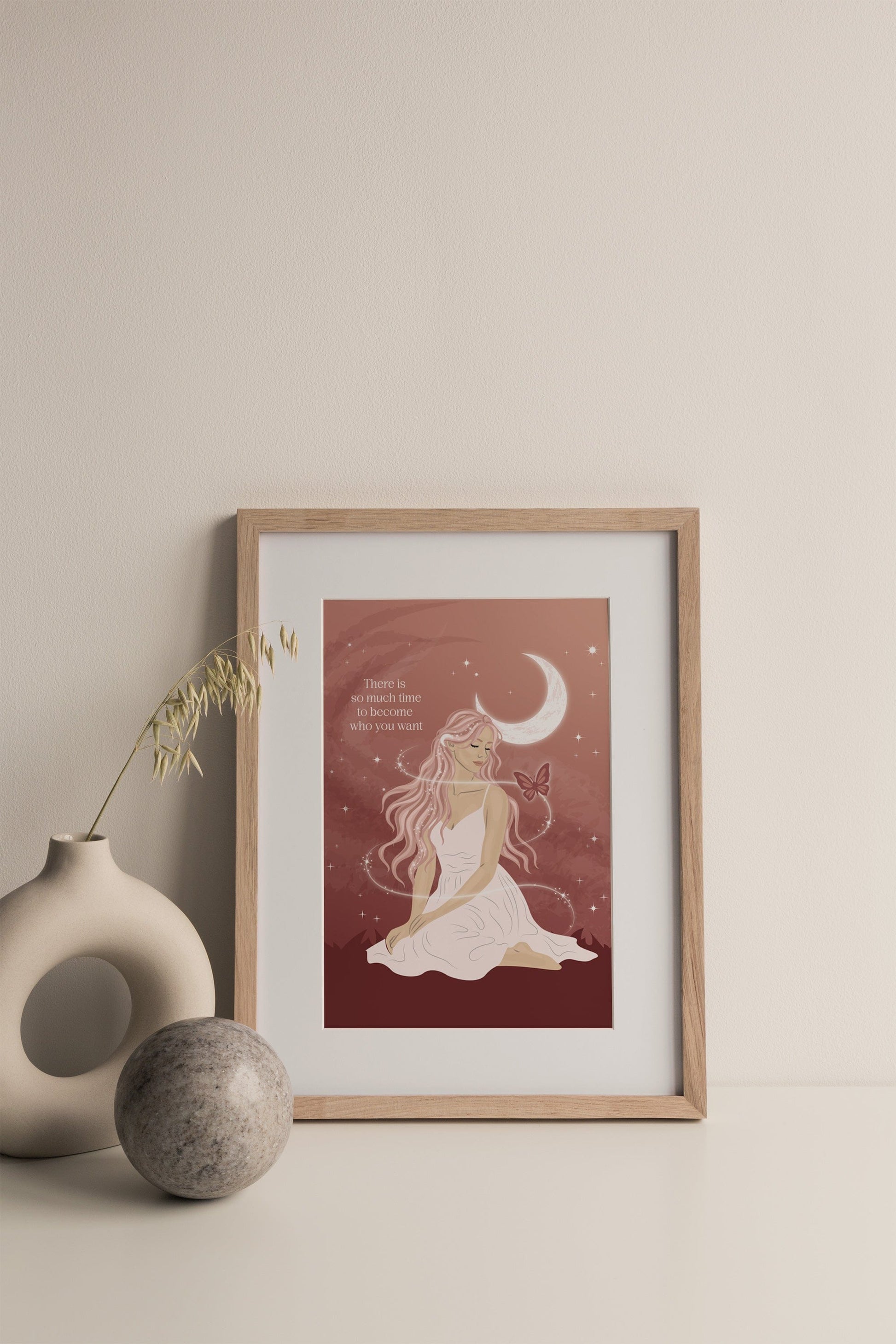 This spiritual and celestial illustration of a woman and the quote "There is so much time to become who you want" helps you embrace the divine feeling of time.