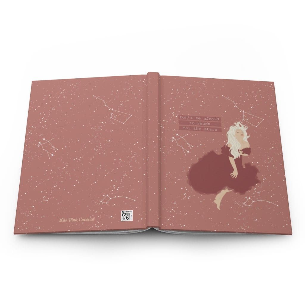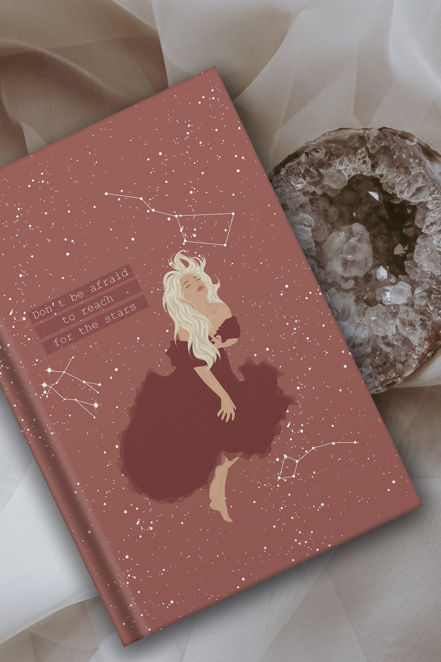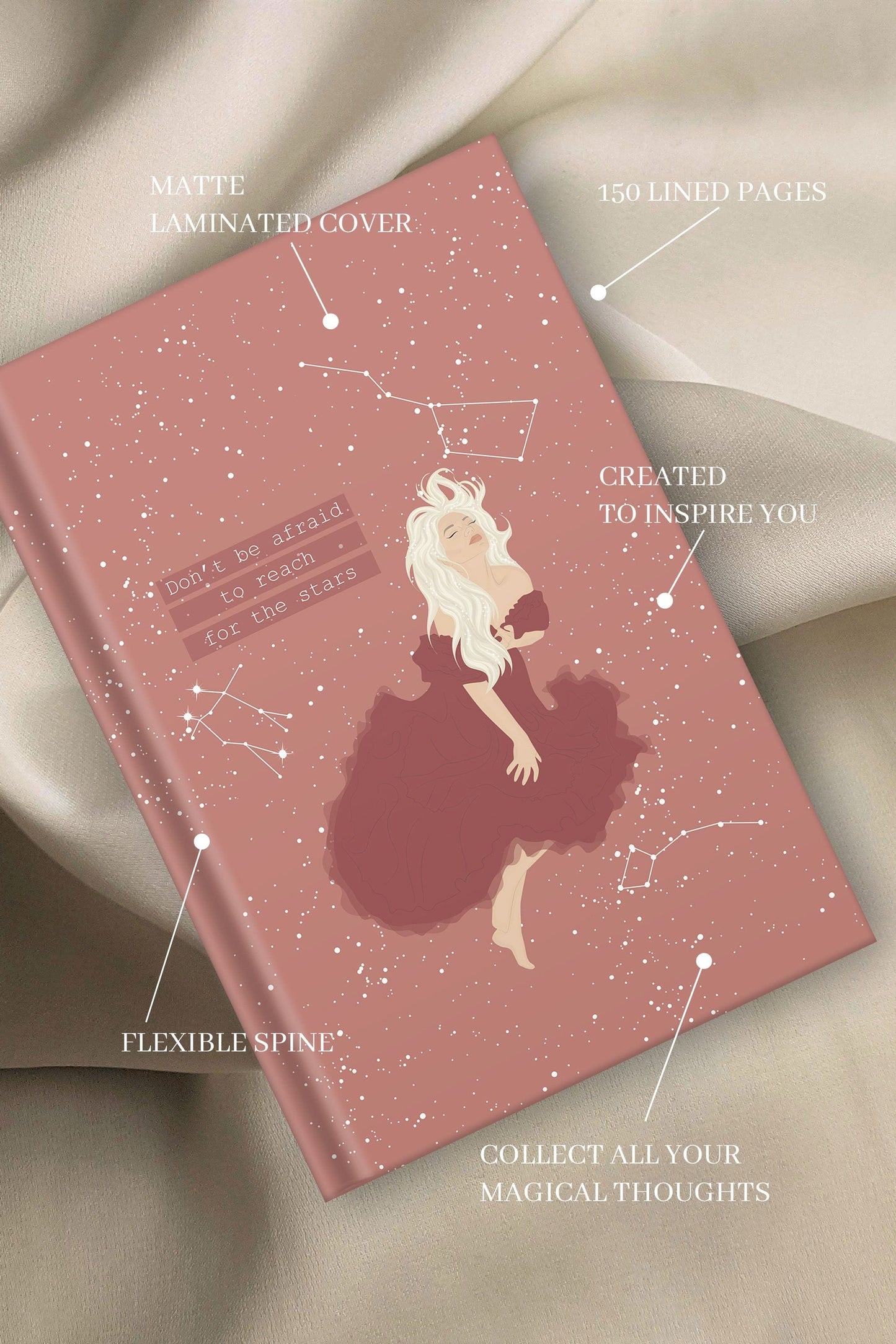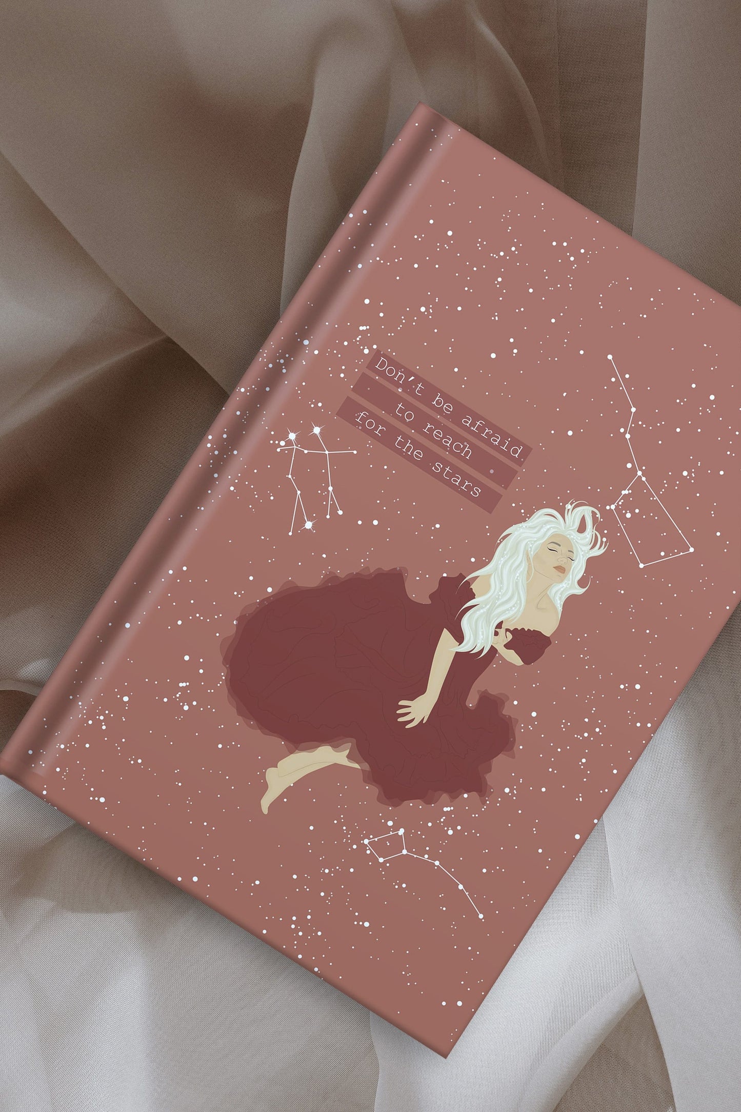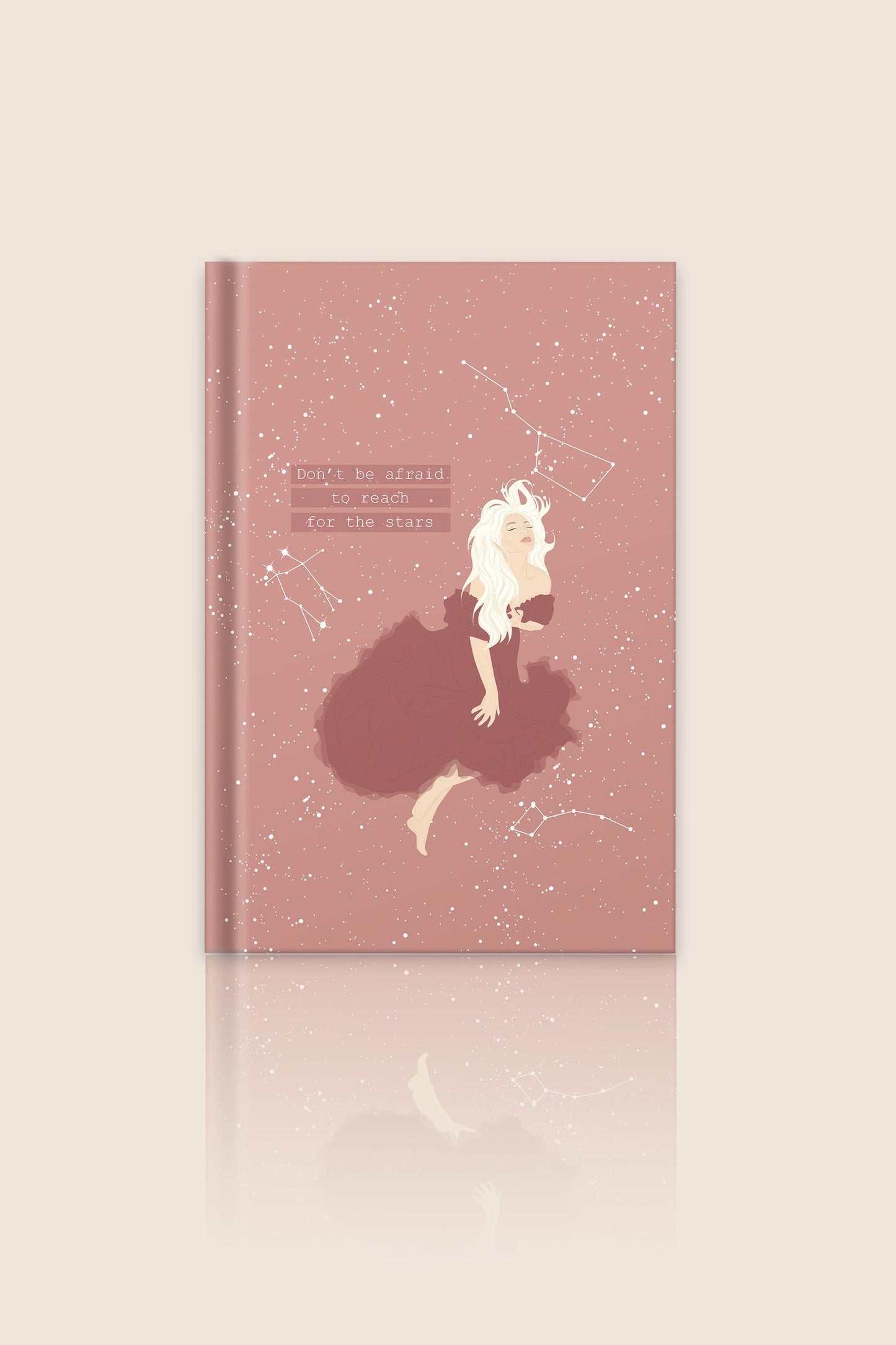 The magical cover, entirely designed by me, shows a woman in the sky and the quote "Don't be afraid to reach for the stars".