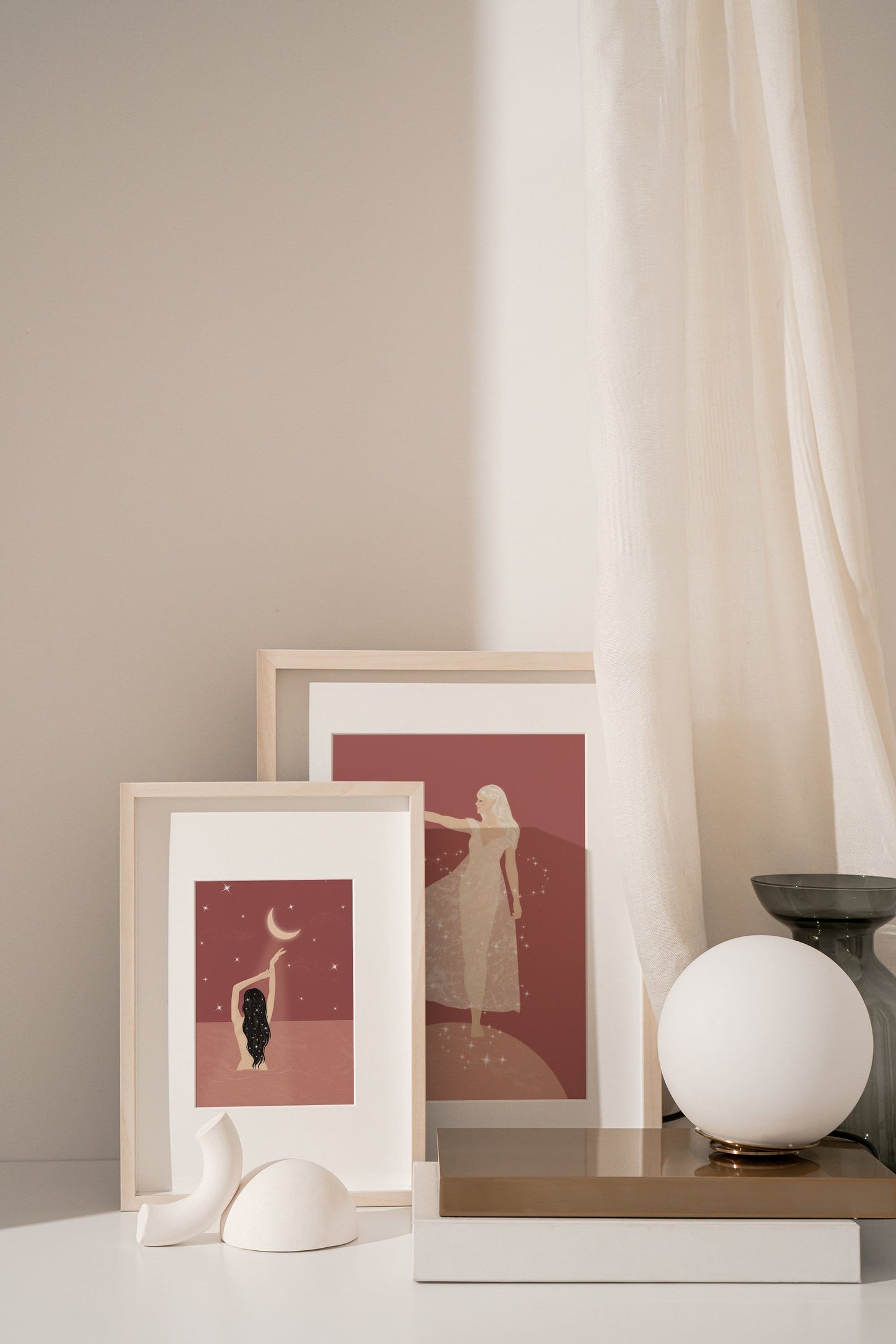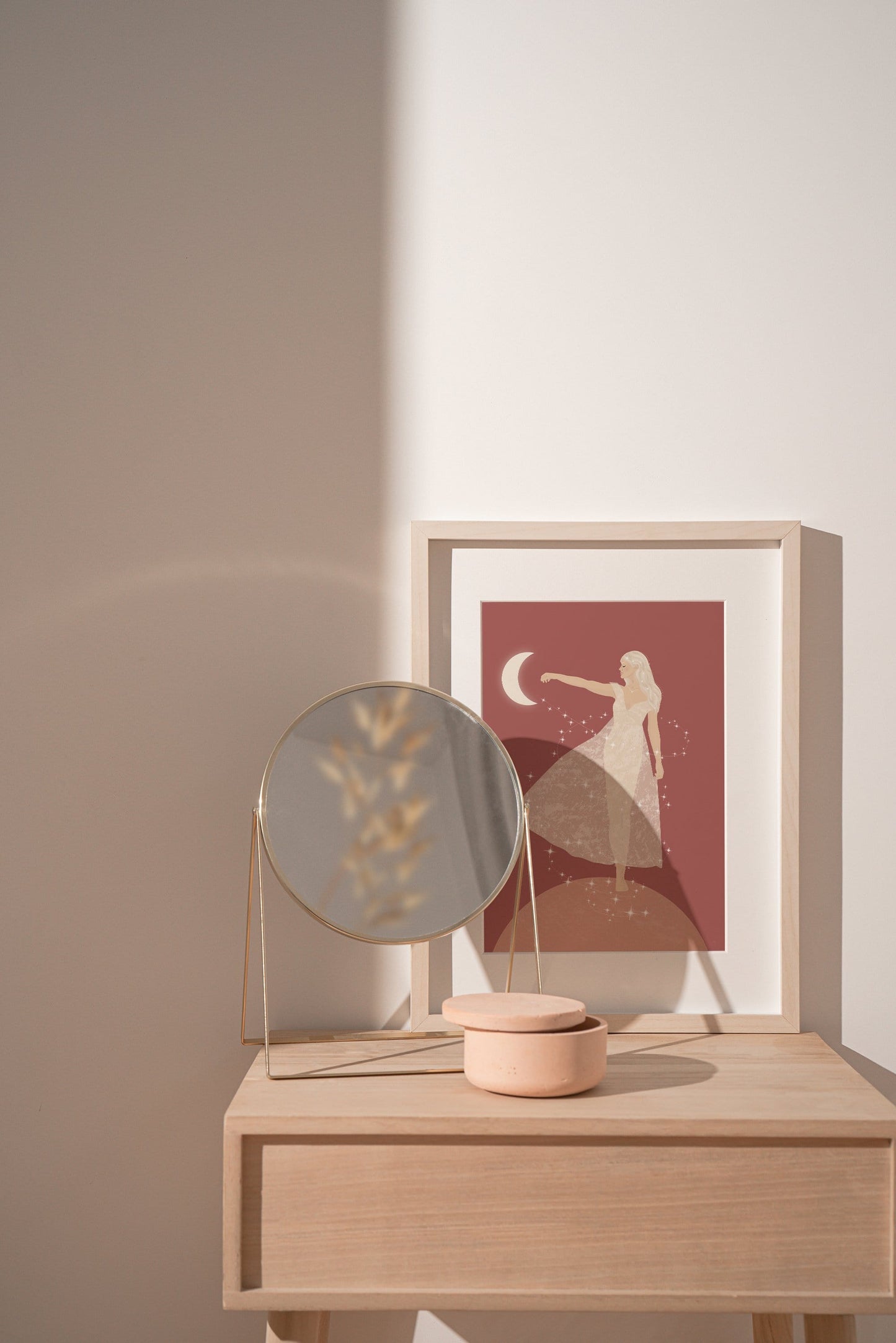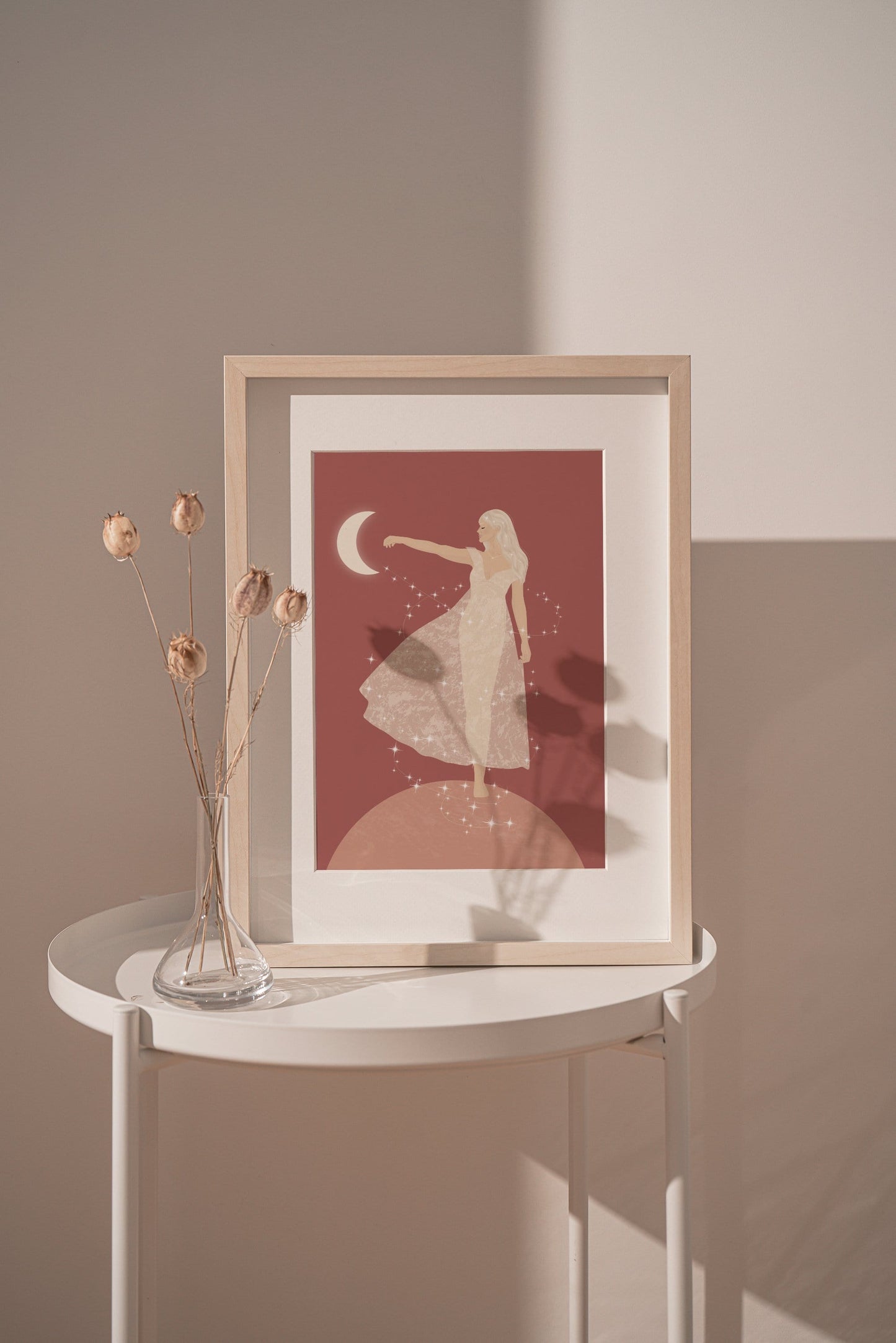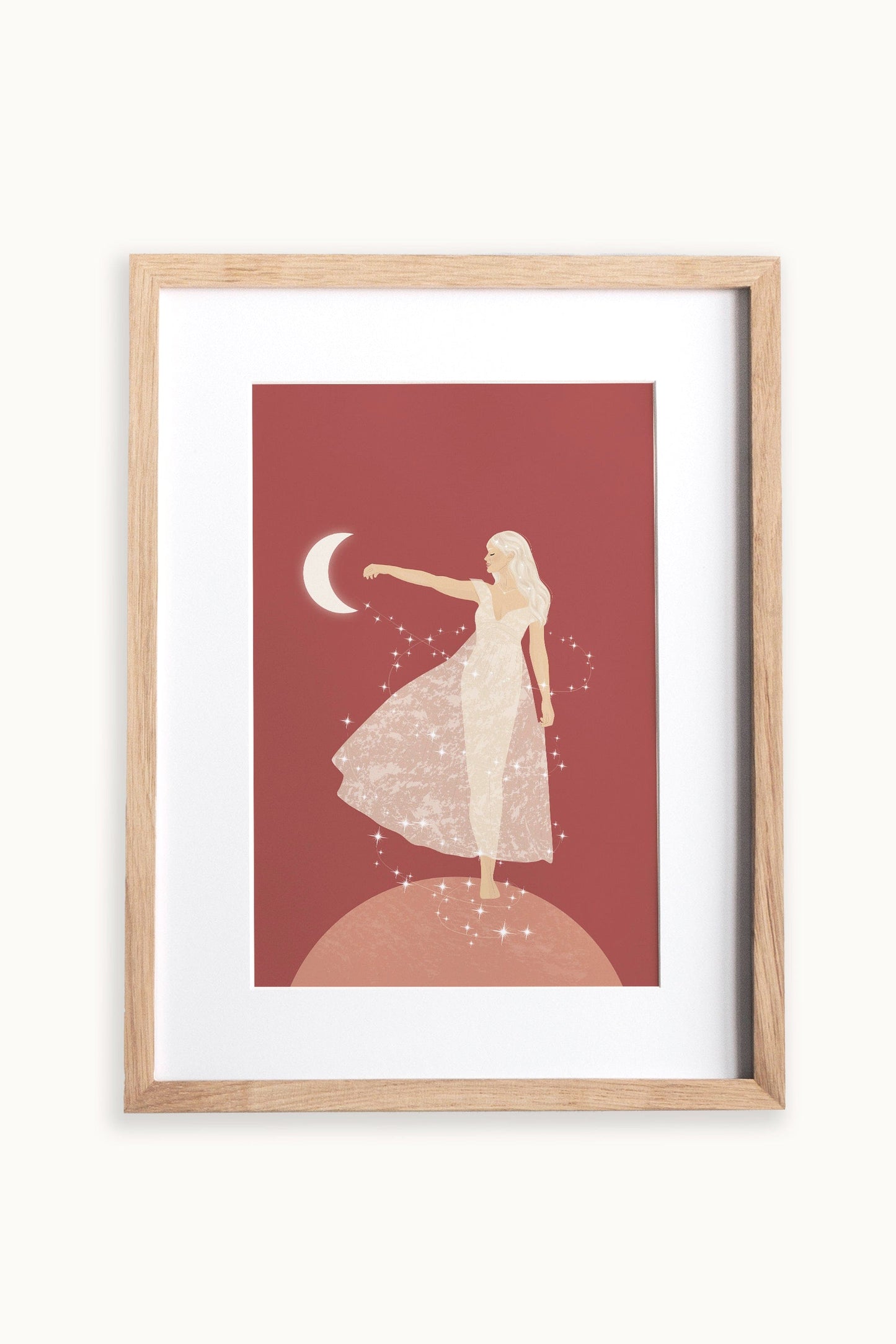 This spiritual and celestial illustration of a goddess on the moon helps you embrace the divine feeling of connection with yourself.