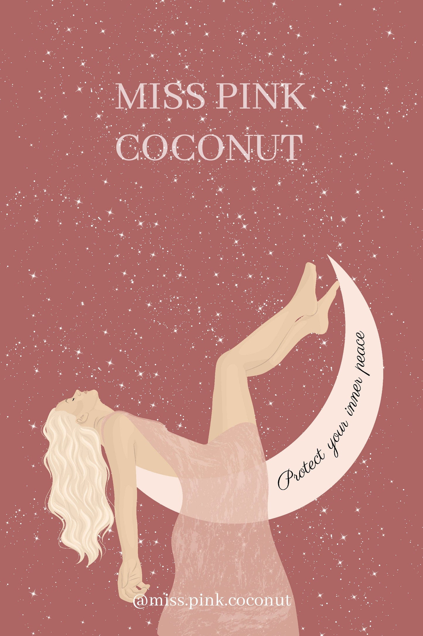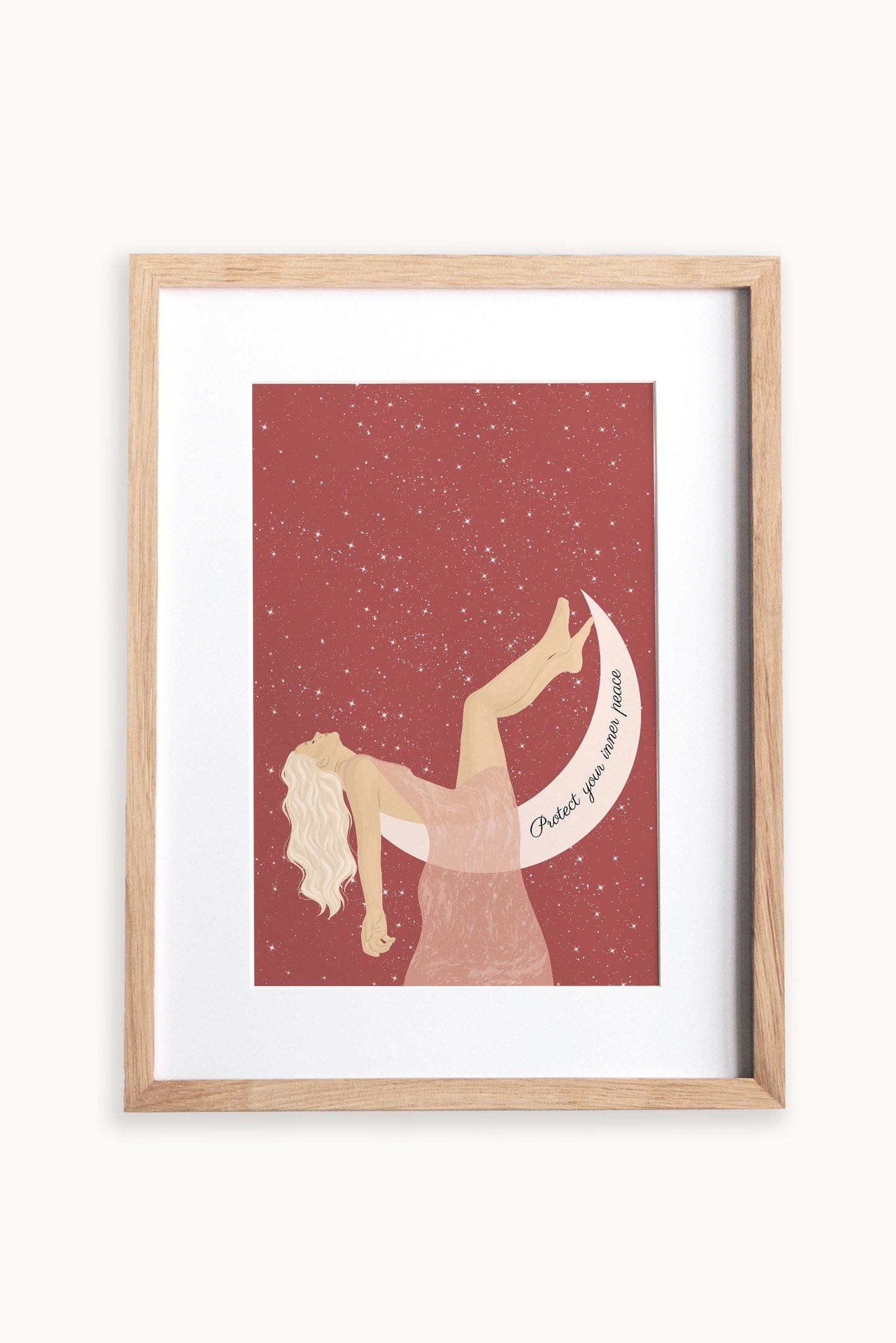 Spiritual and celestial illustration of a woman laying on the moon and the quote "Protect your inner peace".