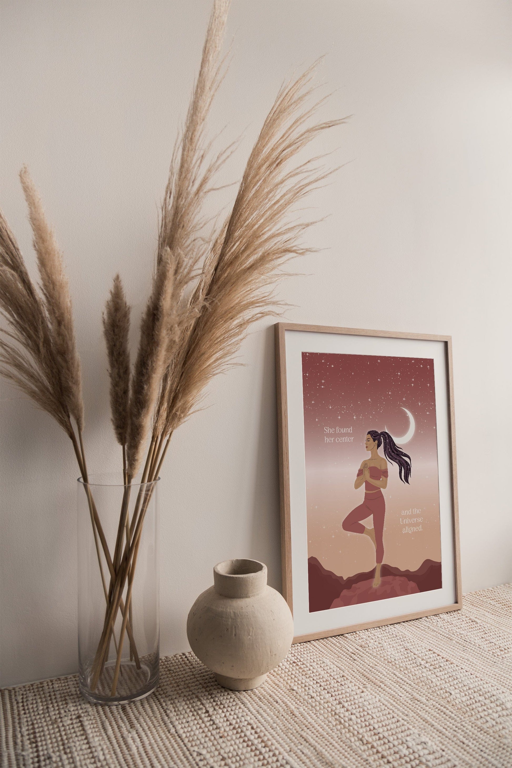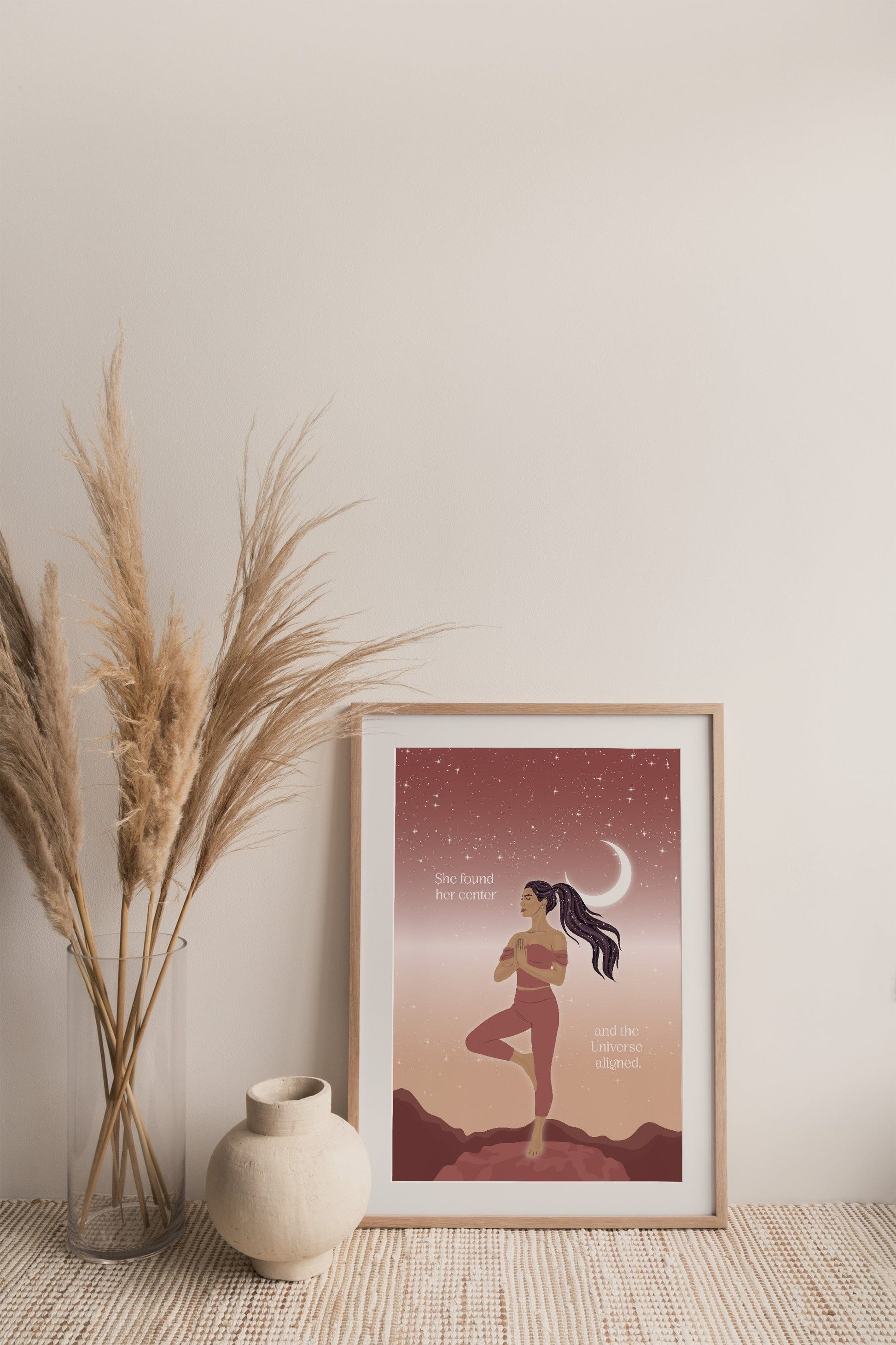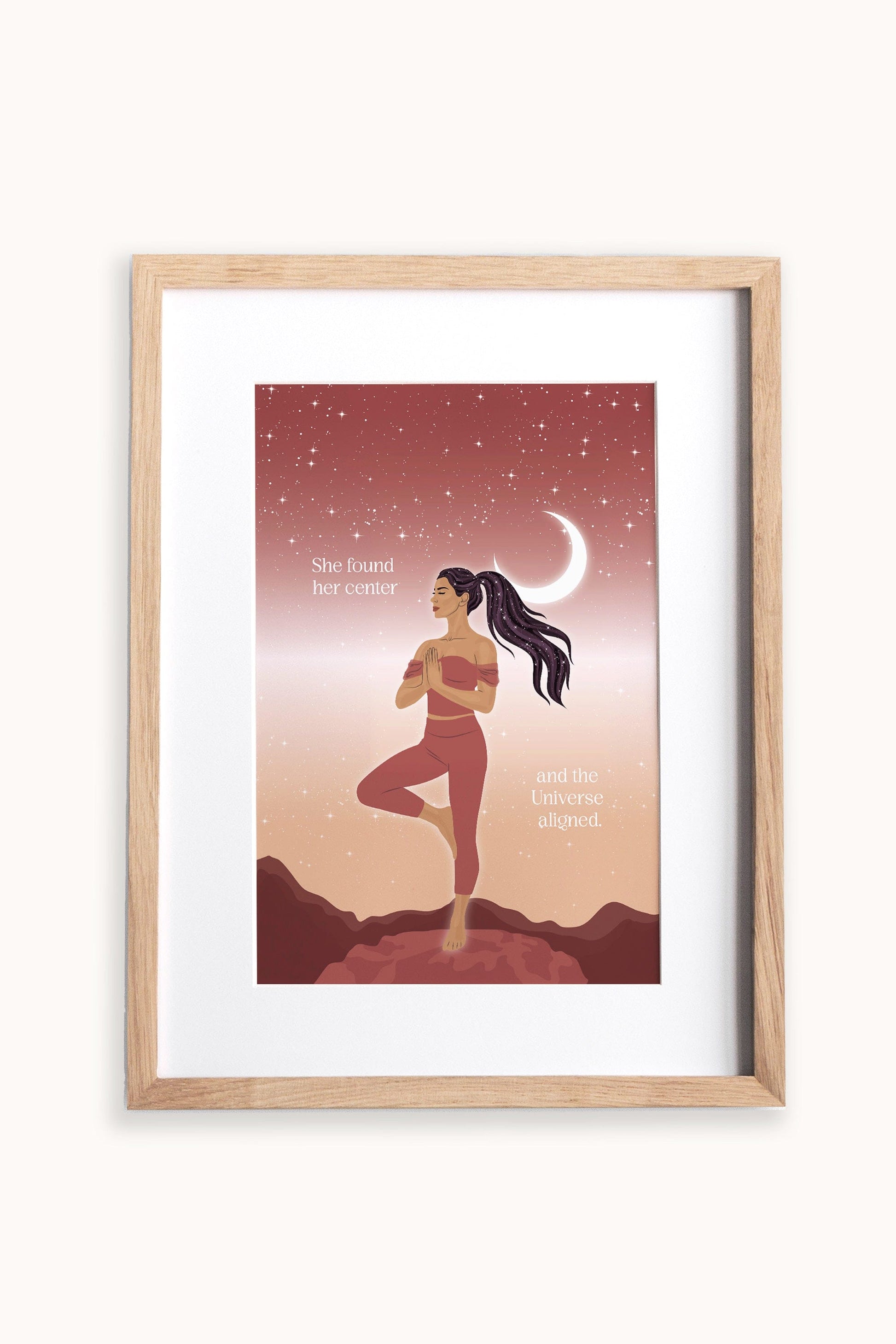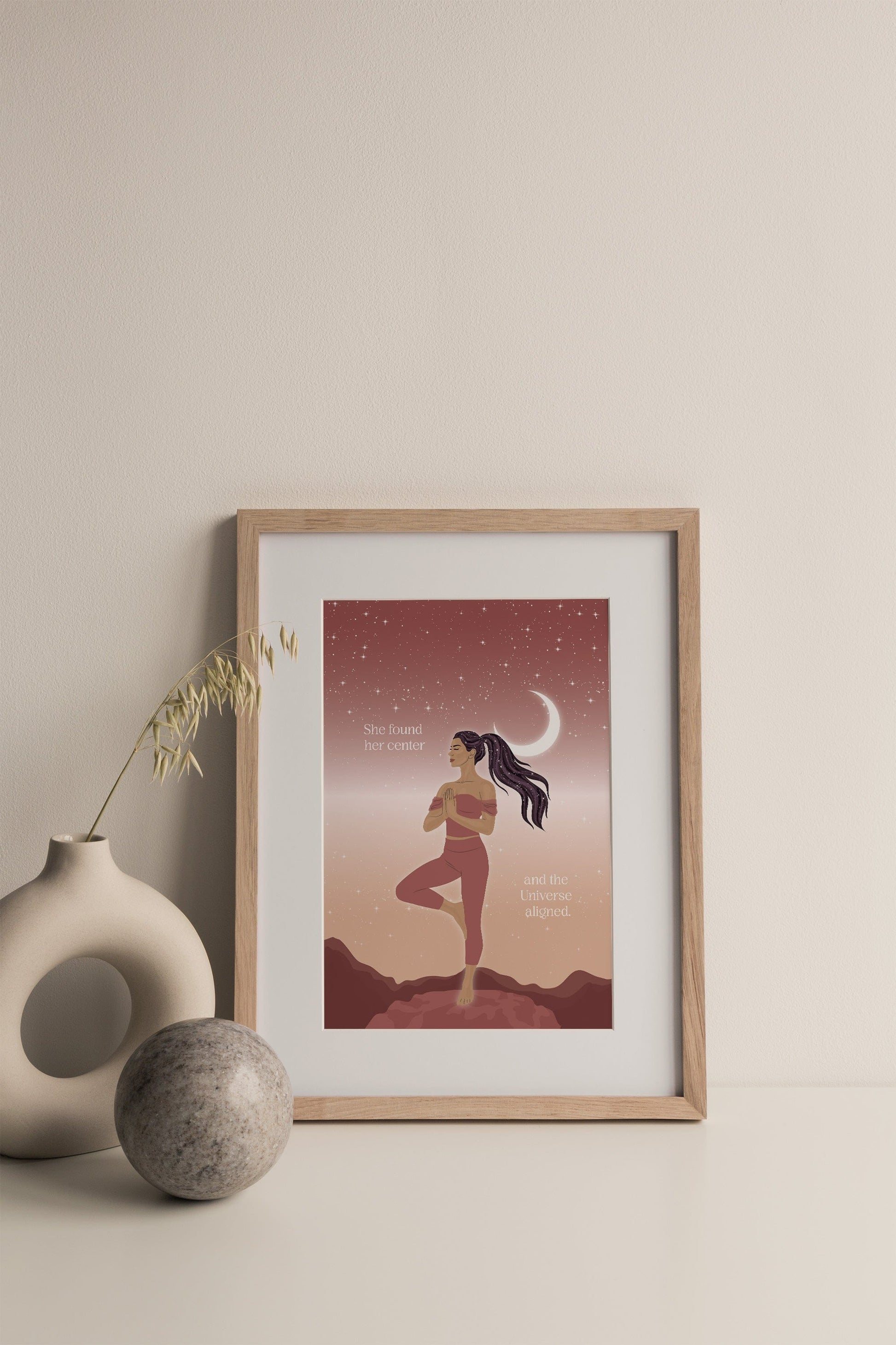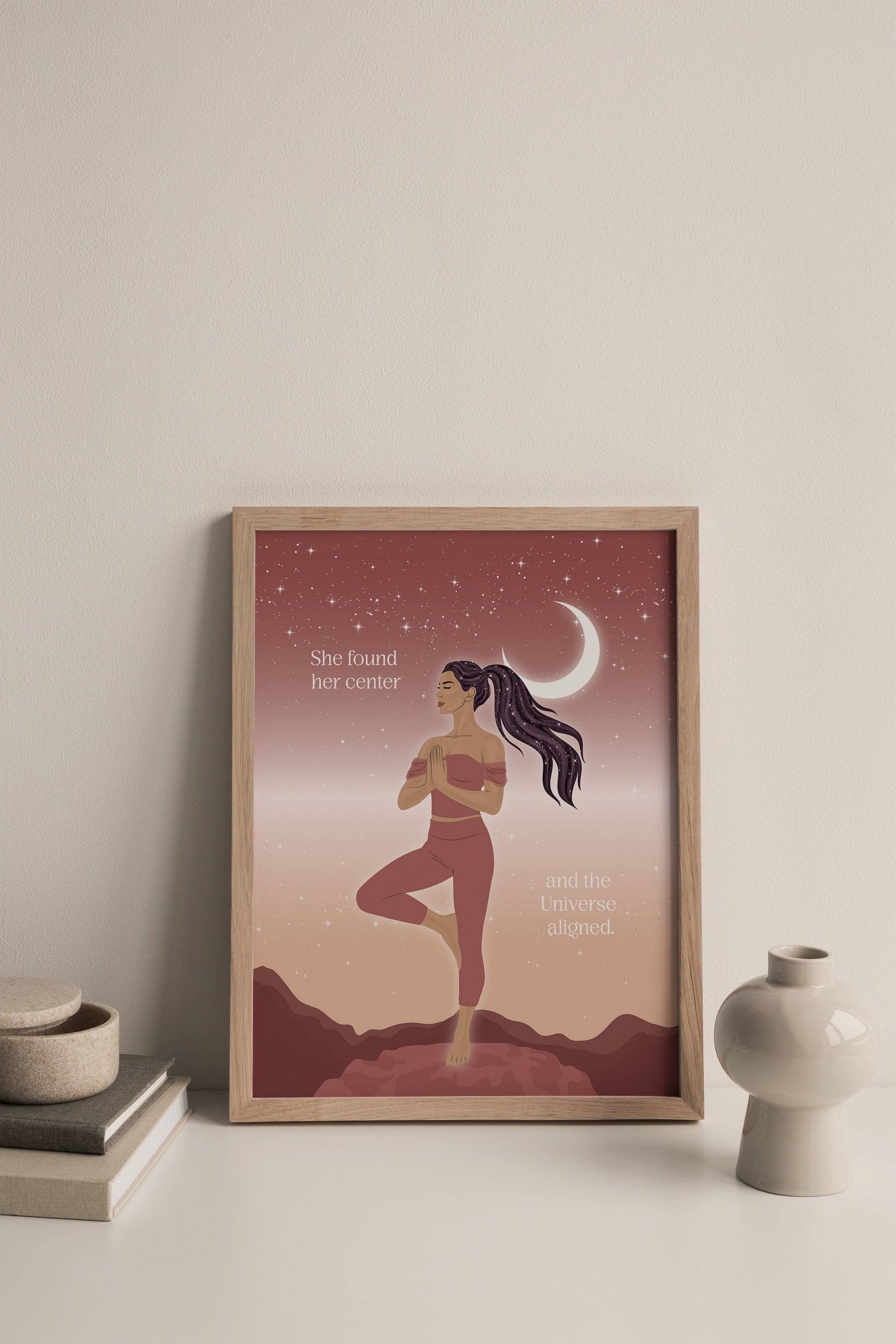 This spiritual and celestial illustration of a woman and the quote "She found her center and the Universe aligned" helps you embrace the divine feeling of balance.
