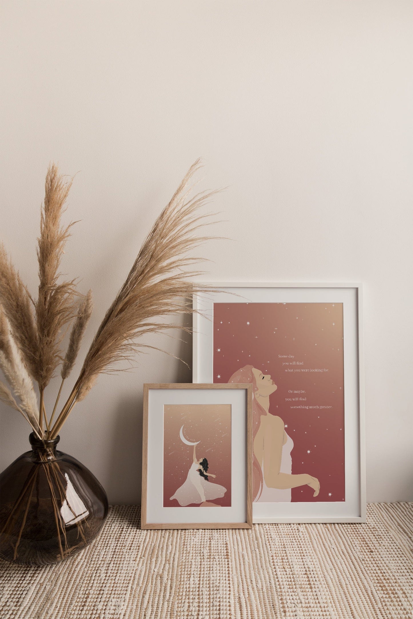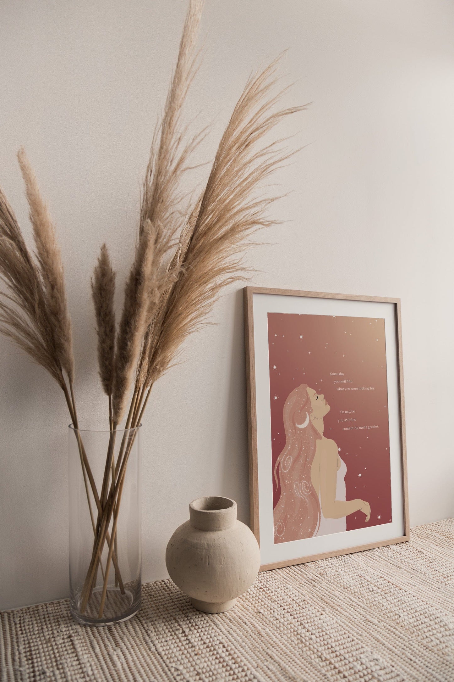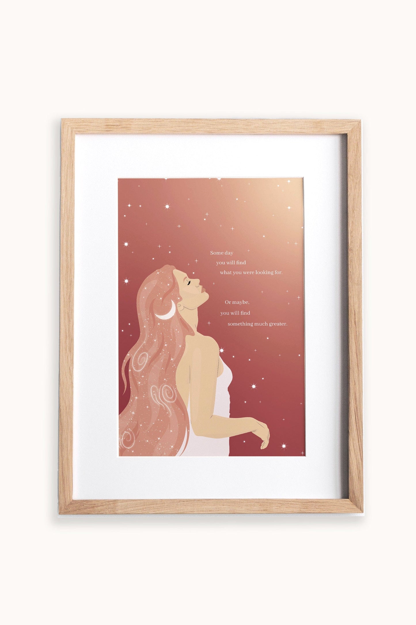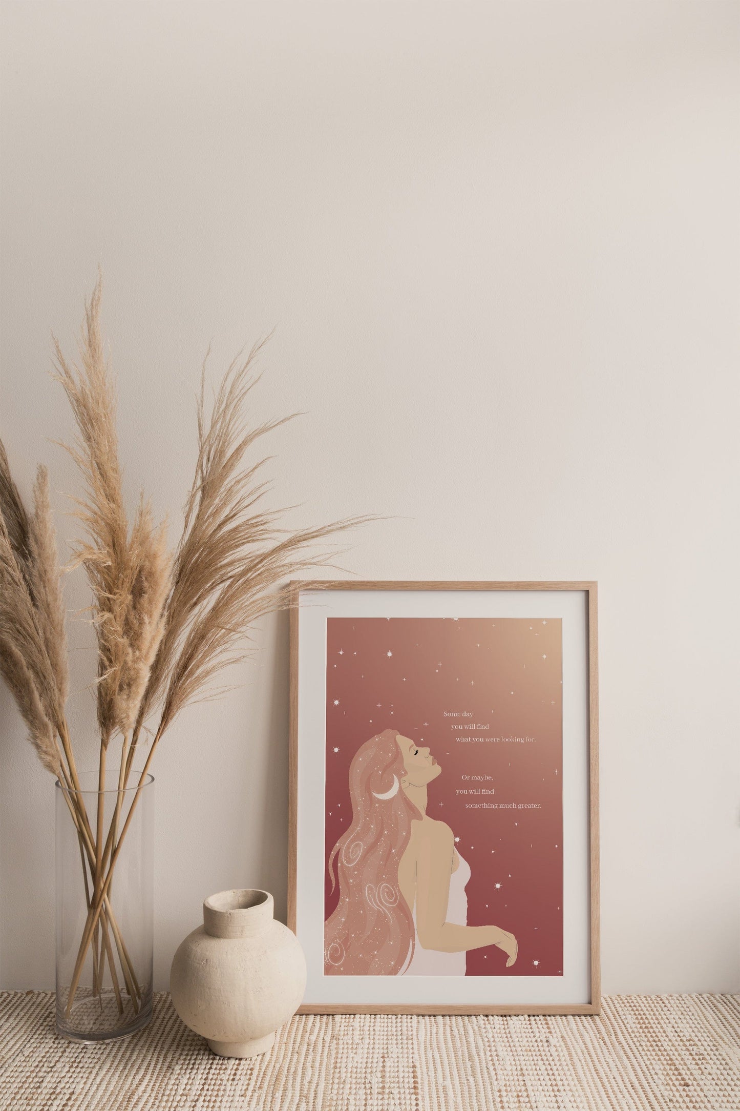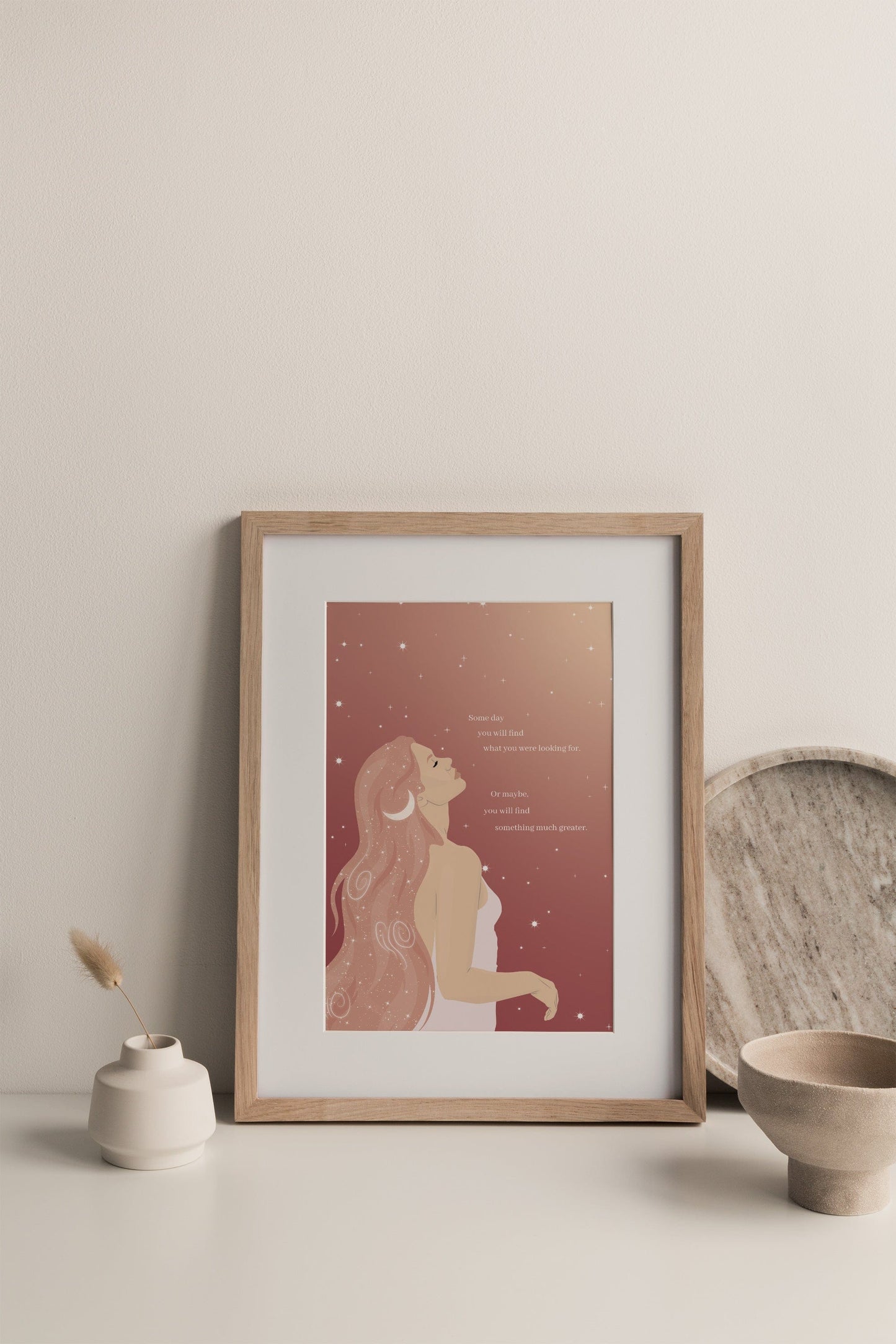 This spiritual and celestial illustration of a woman and the quote "Some day you fill find what you were looking for. Or maybe you will find something much greater." helps you embrace the divine feeling of manifestation and positive thinking.