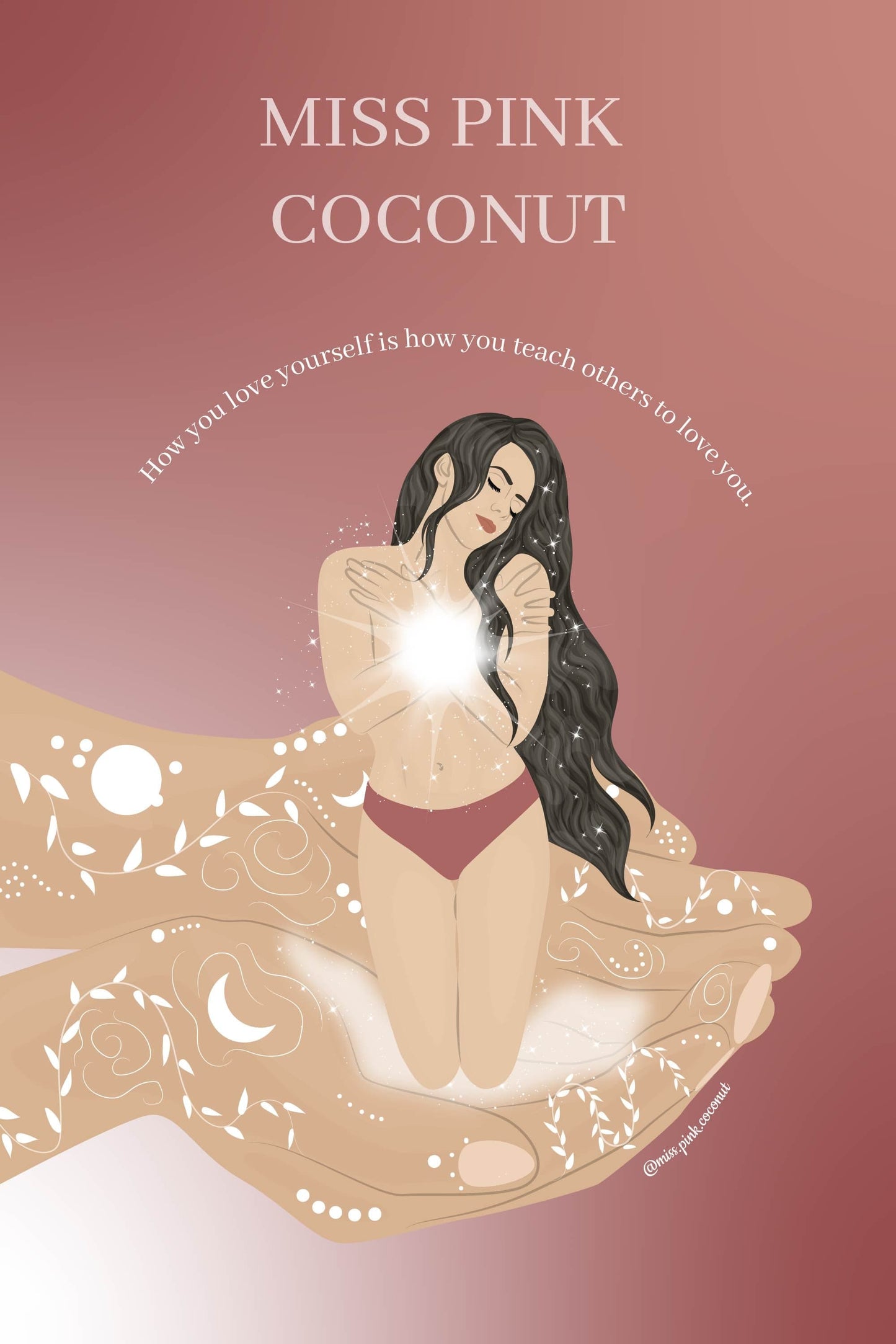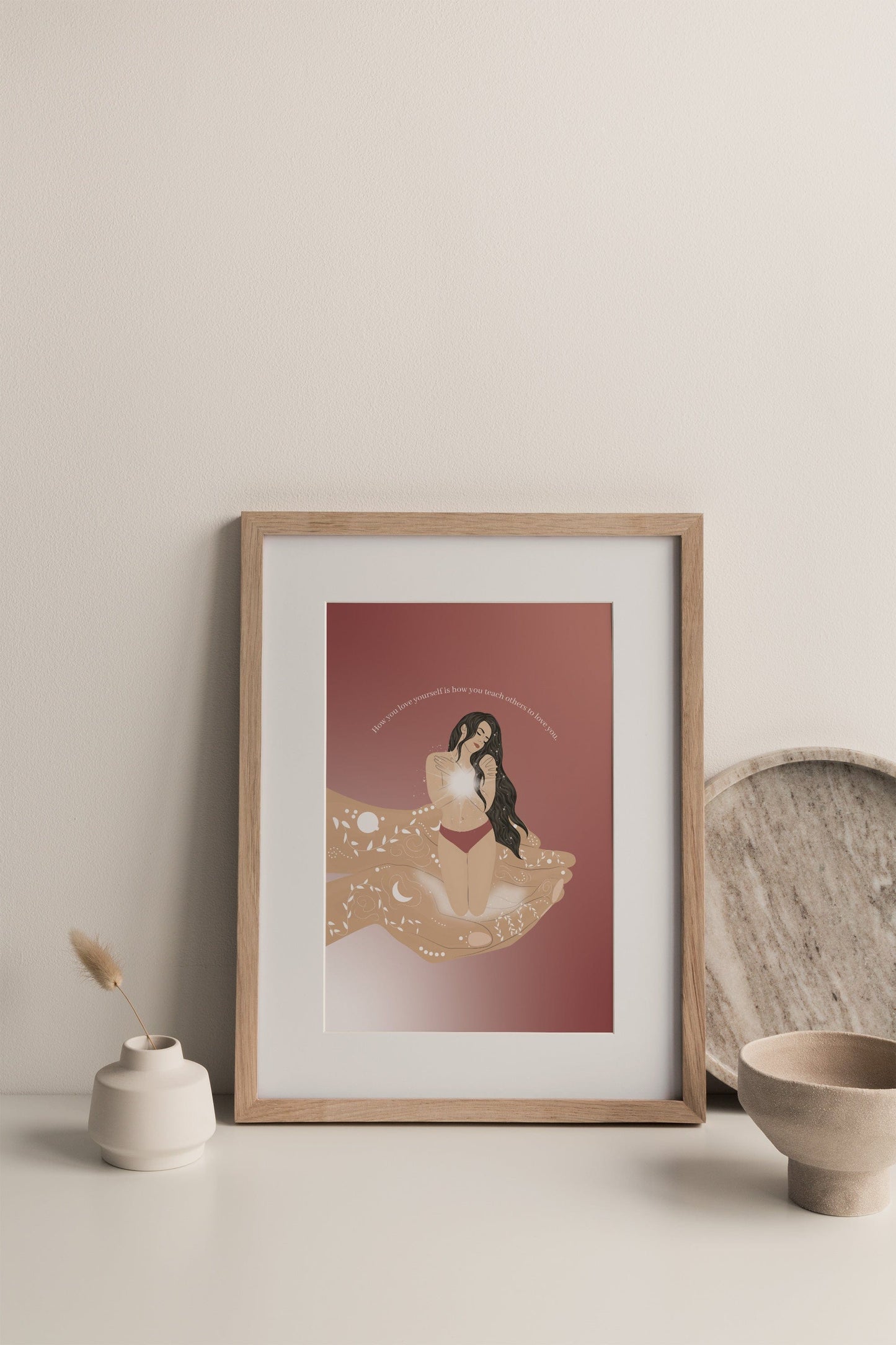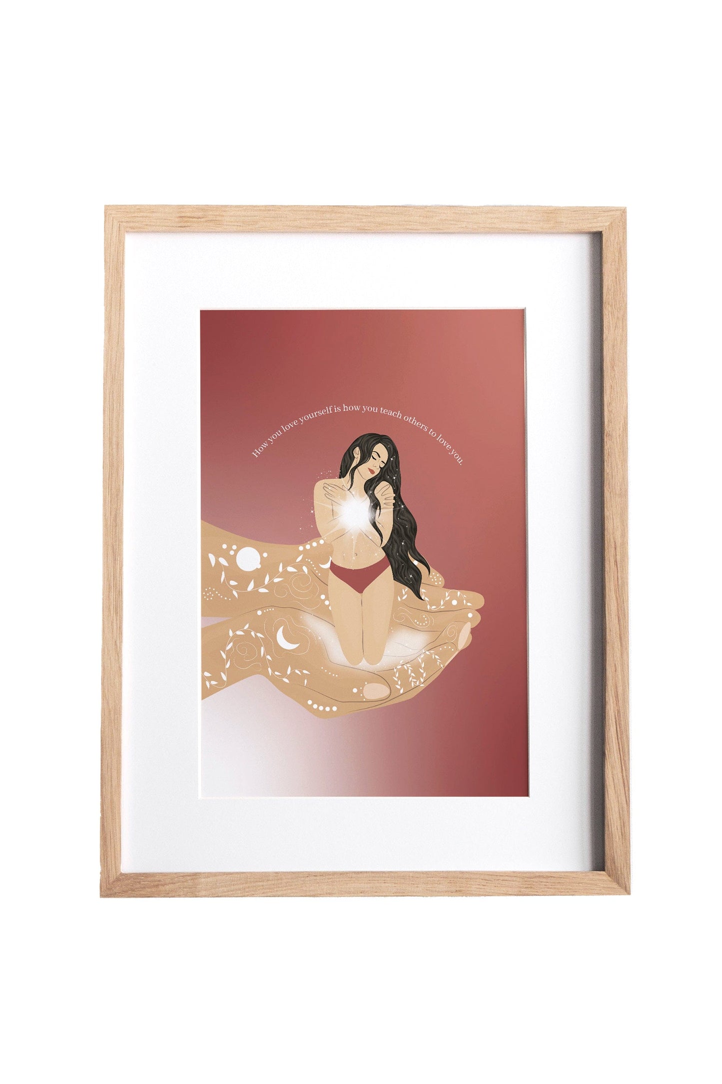 This spiritual and celestial illustration of a woman and the quote "How you love yourself is how you teach others to love you." helps you embrace the divine feeling of self-love and female empowerment.