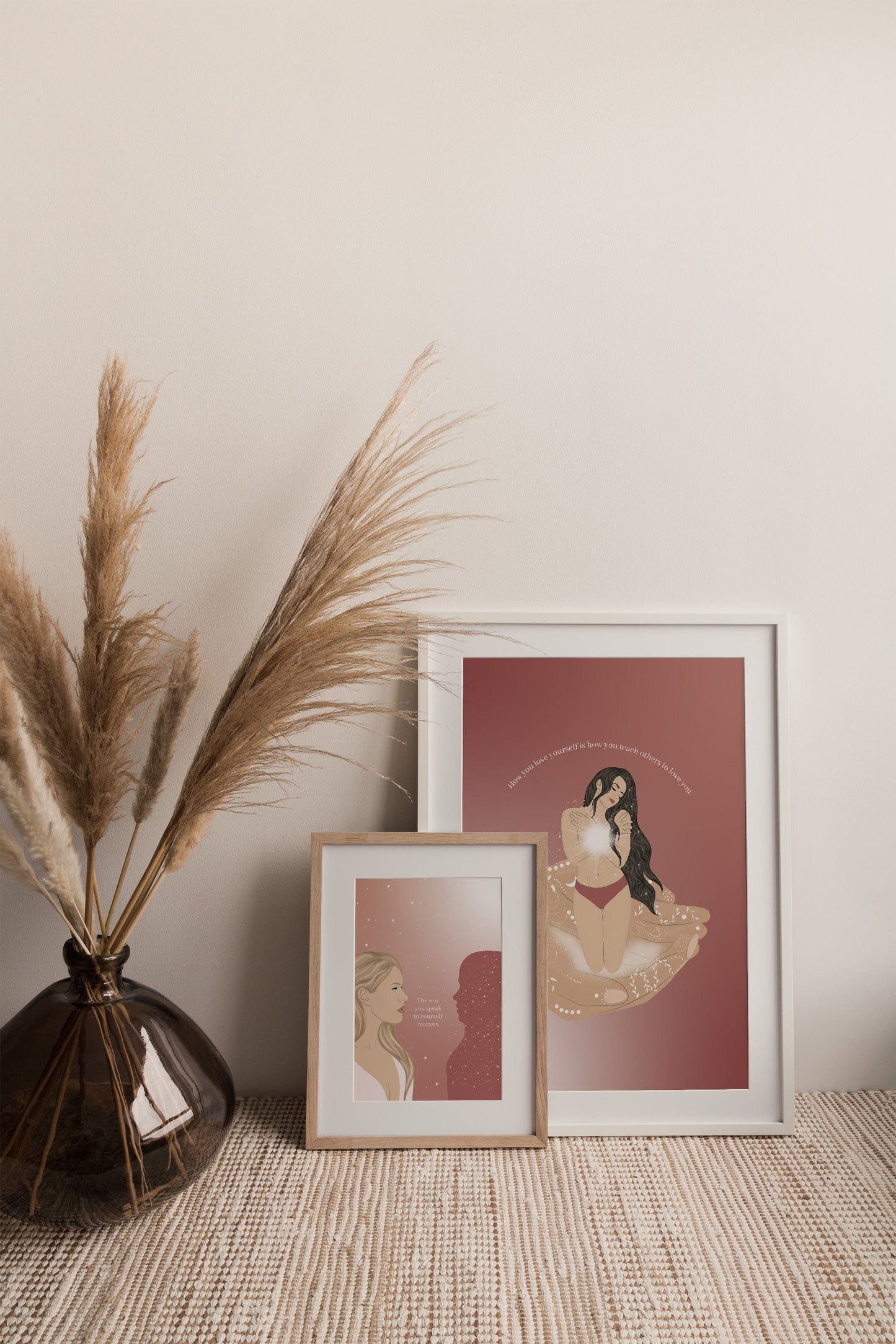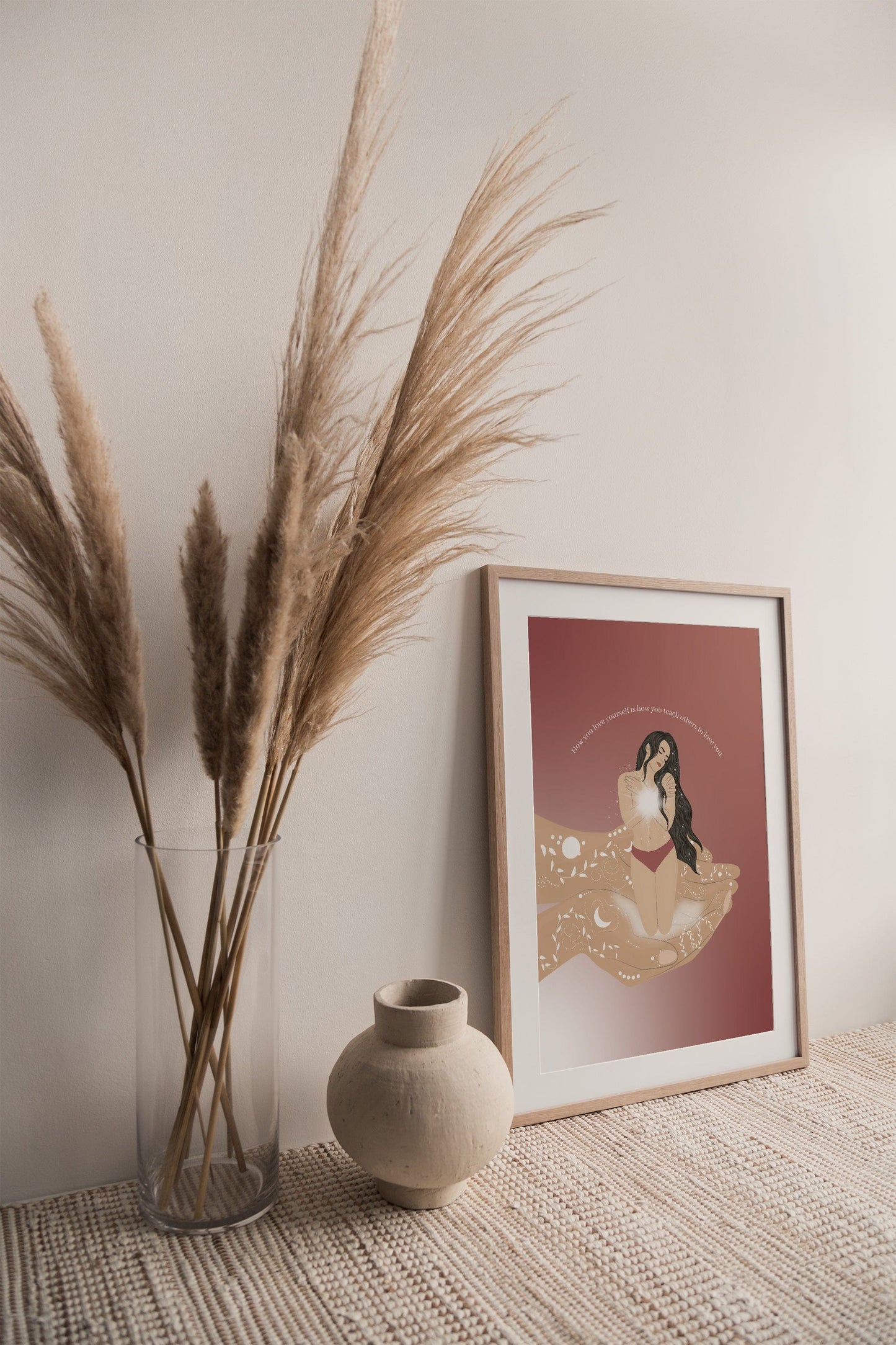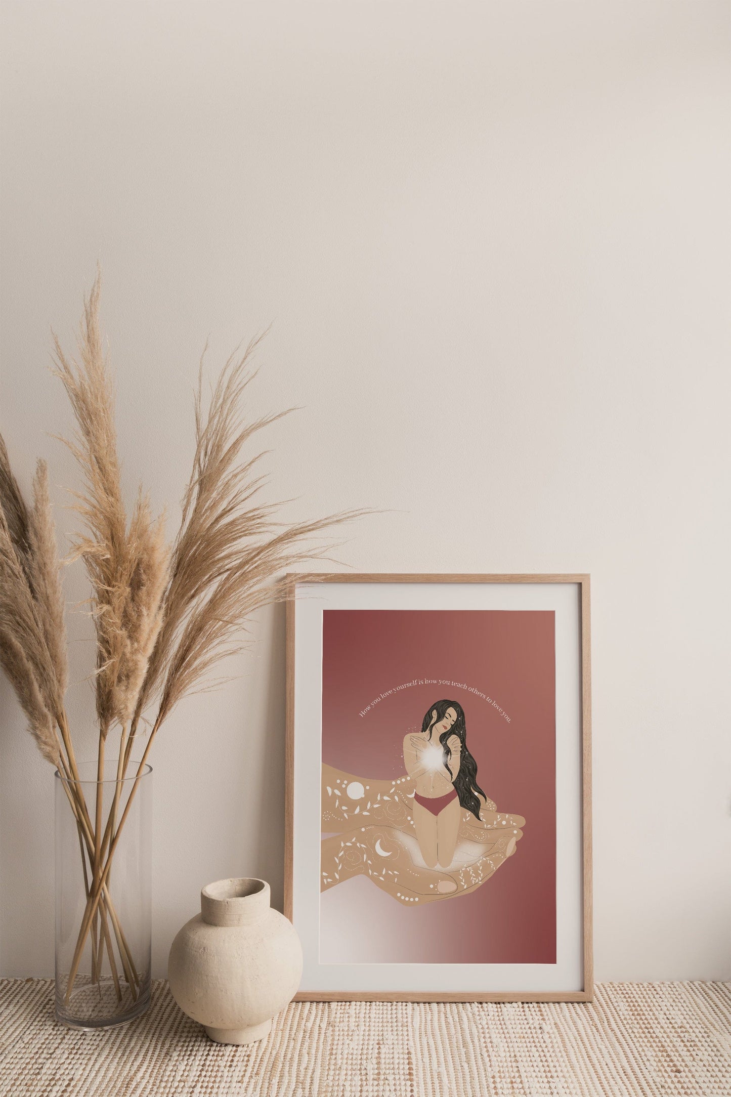 This spiritual and celestial illustration of a woman and the quote "How you love yourself is how you teach others to love you." helps you embrace the divine feeling of self-love and female empowerment.