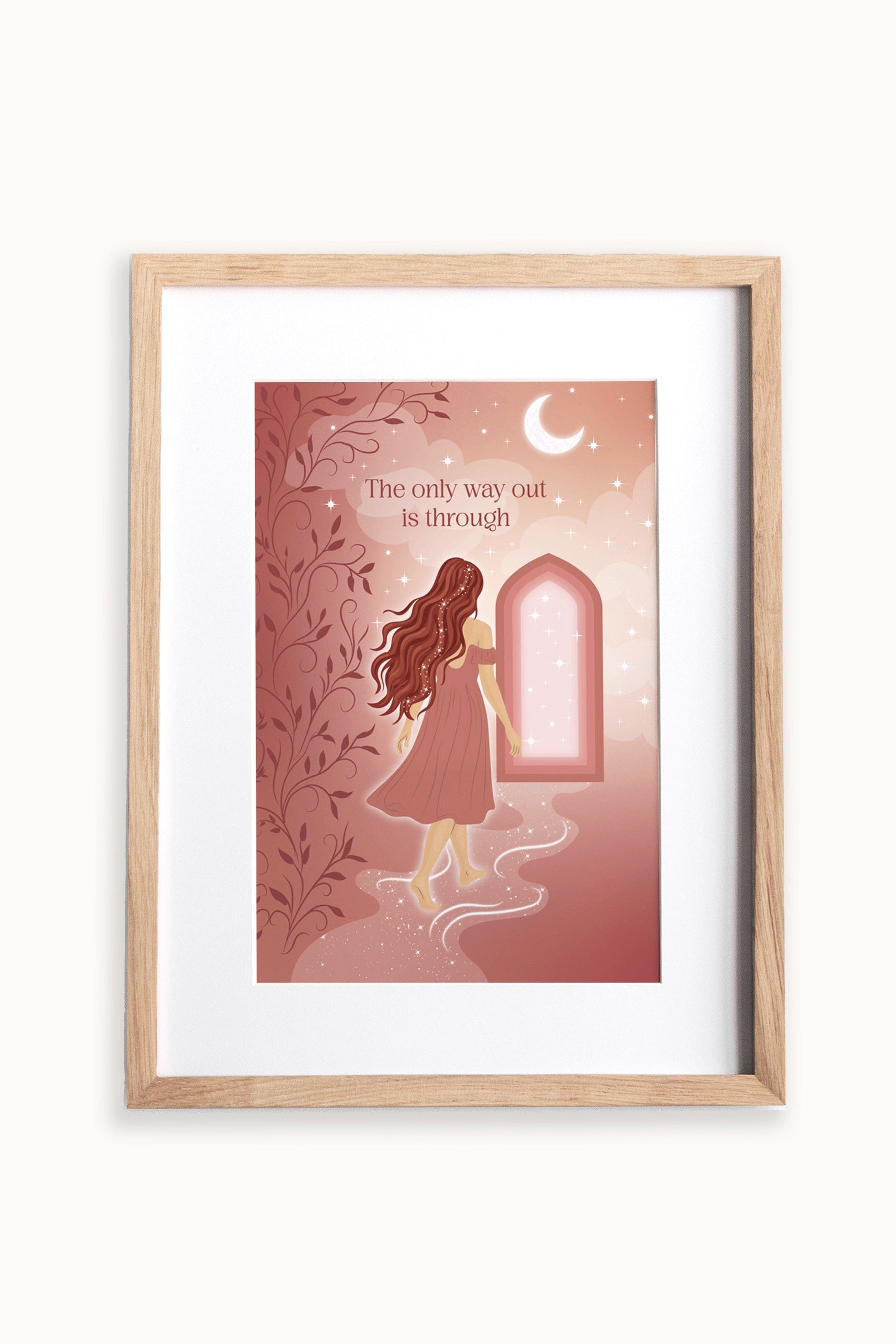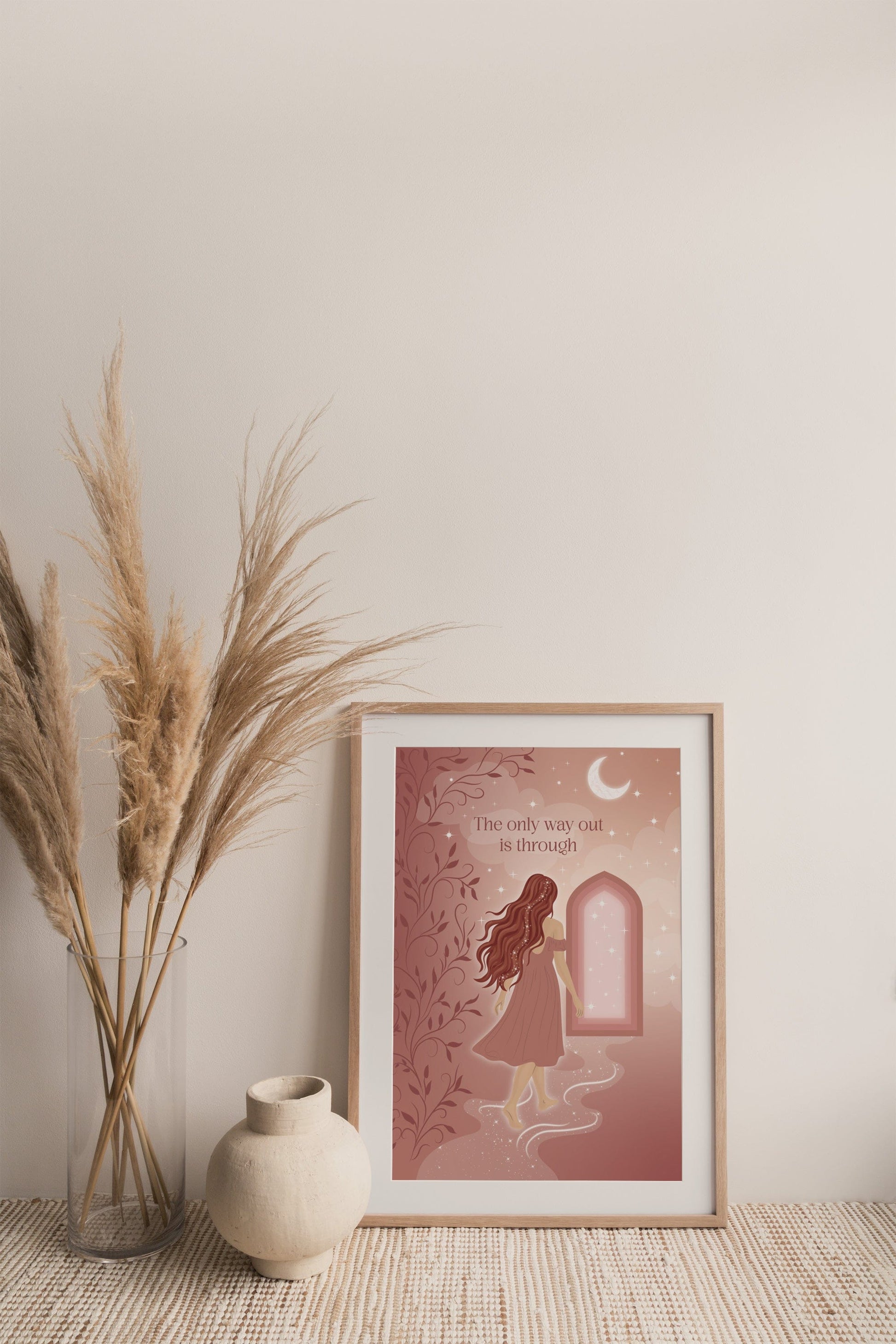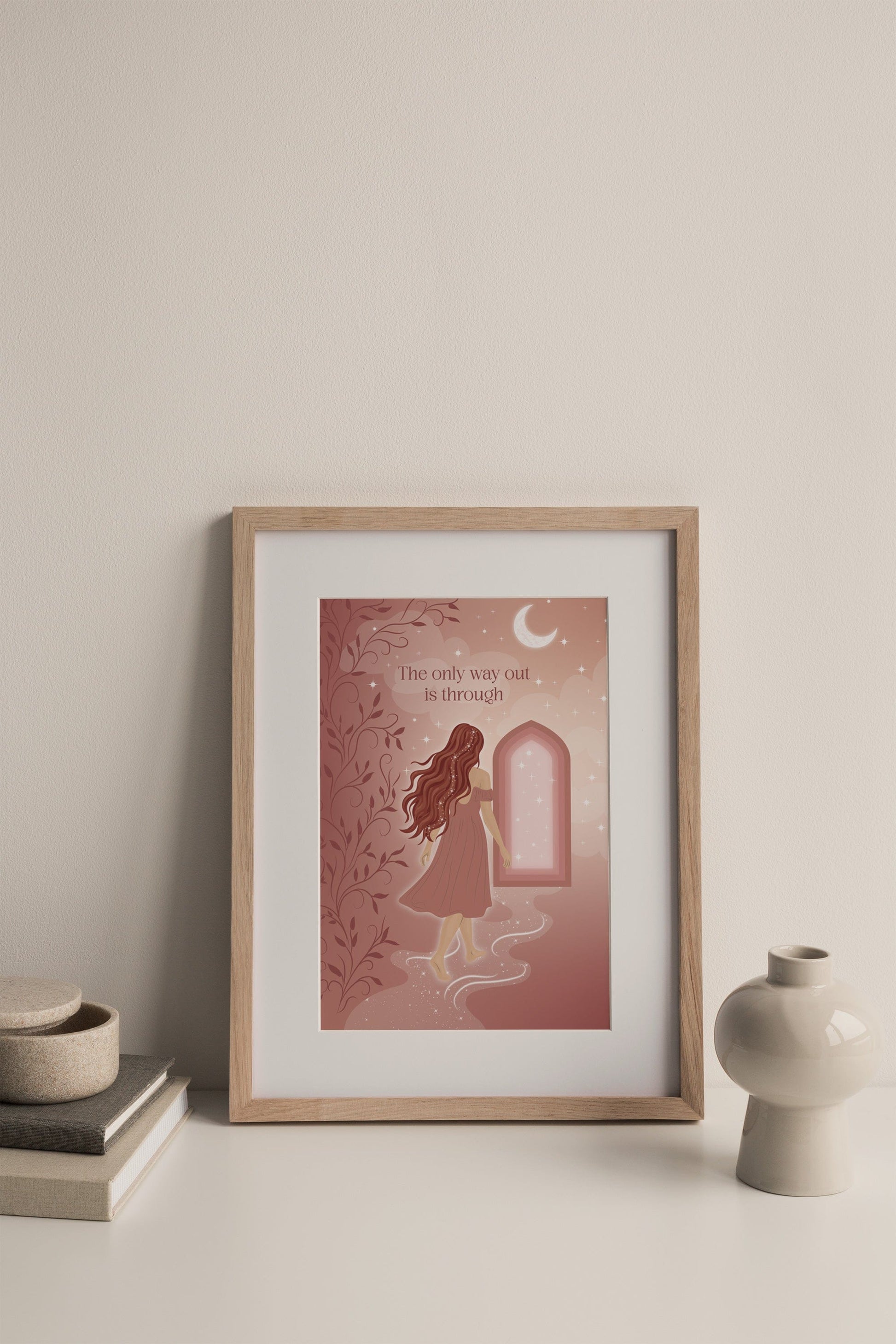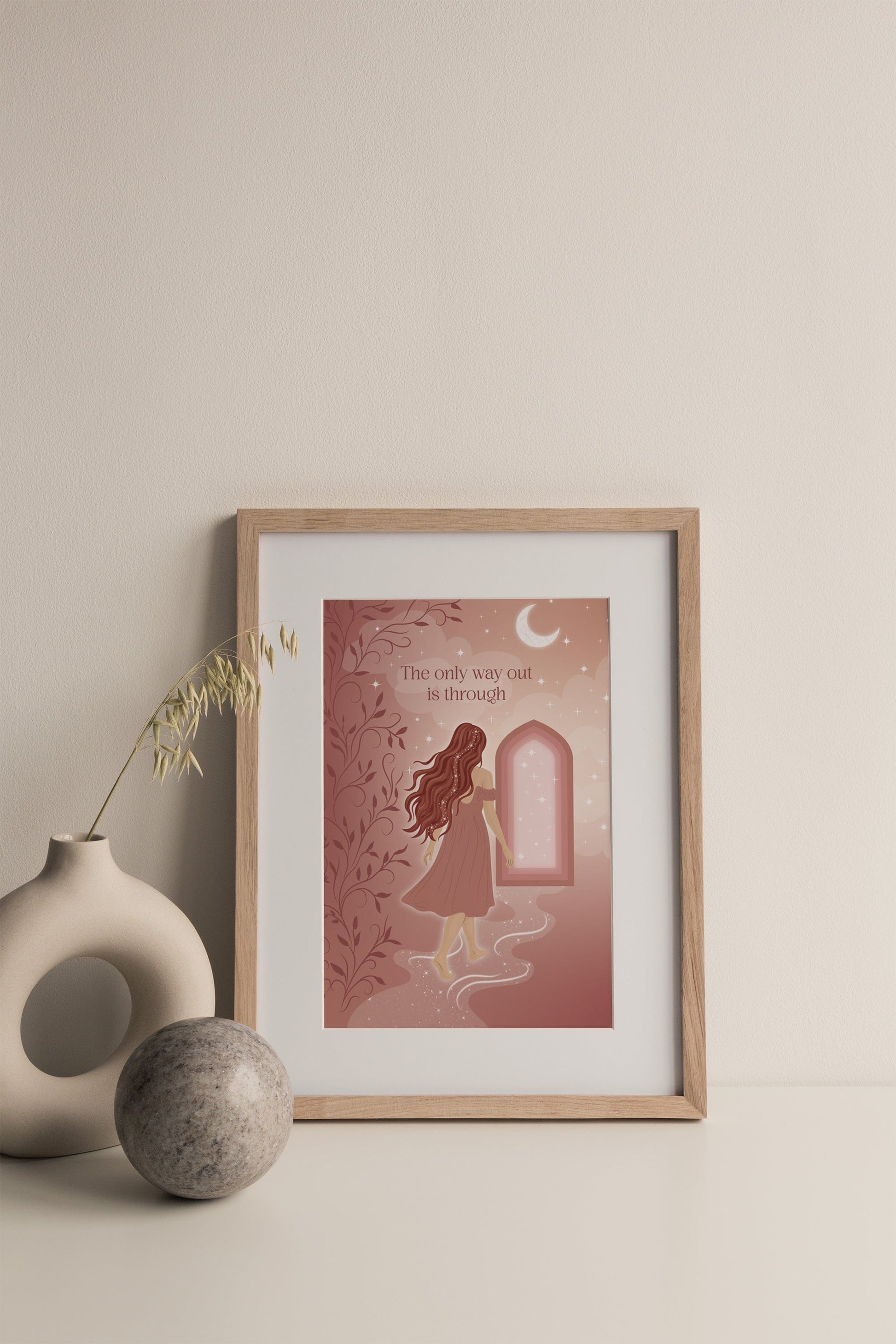 This spiritual and celestial illustration of a woman and the quote "The only way out is through" helps you embrace the divine feeling of strength.