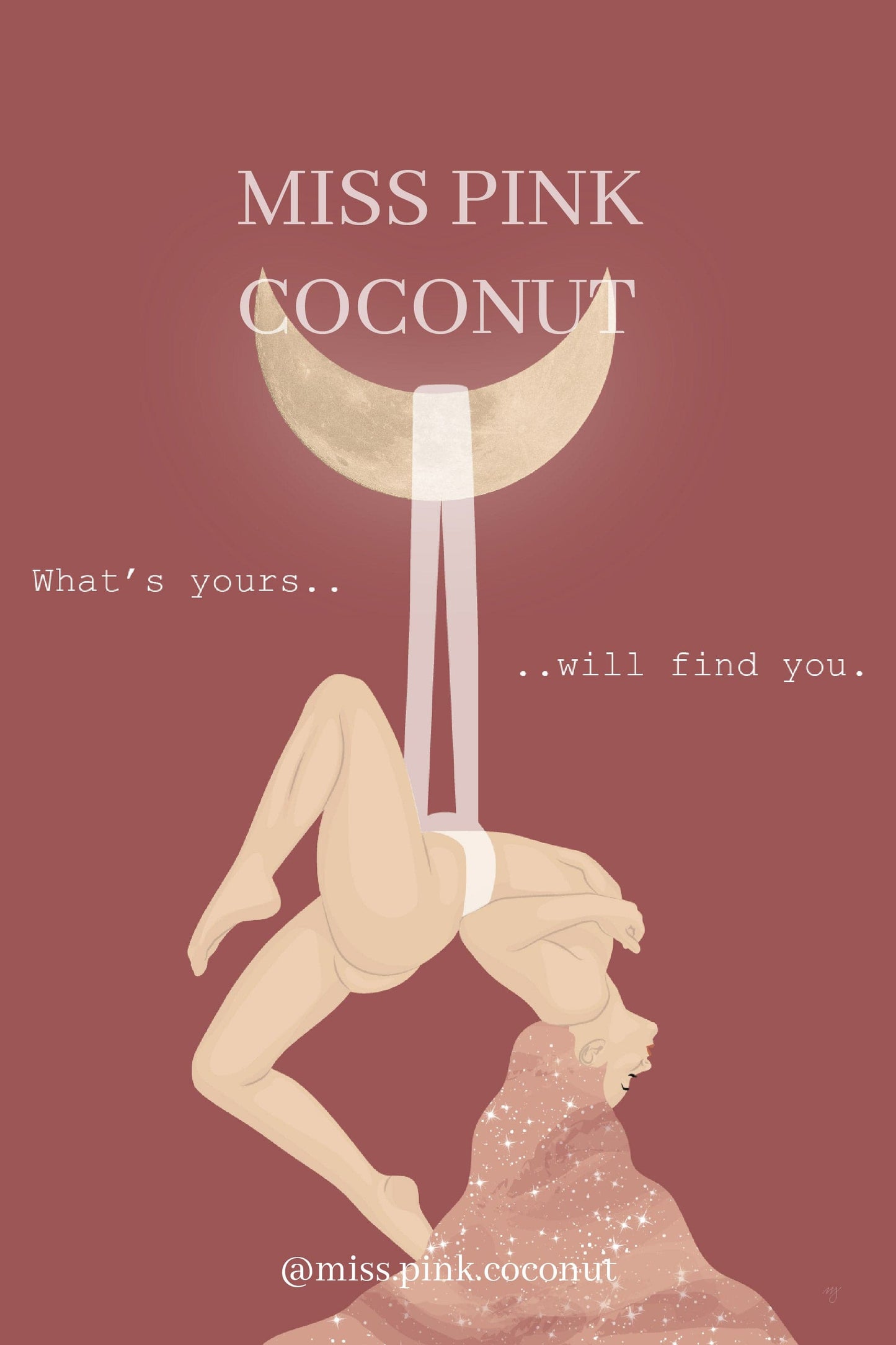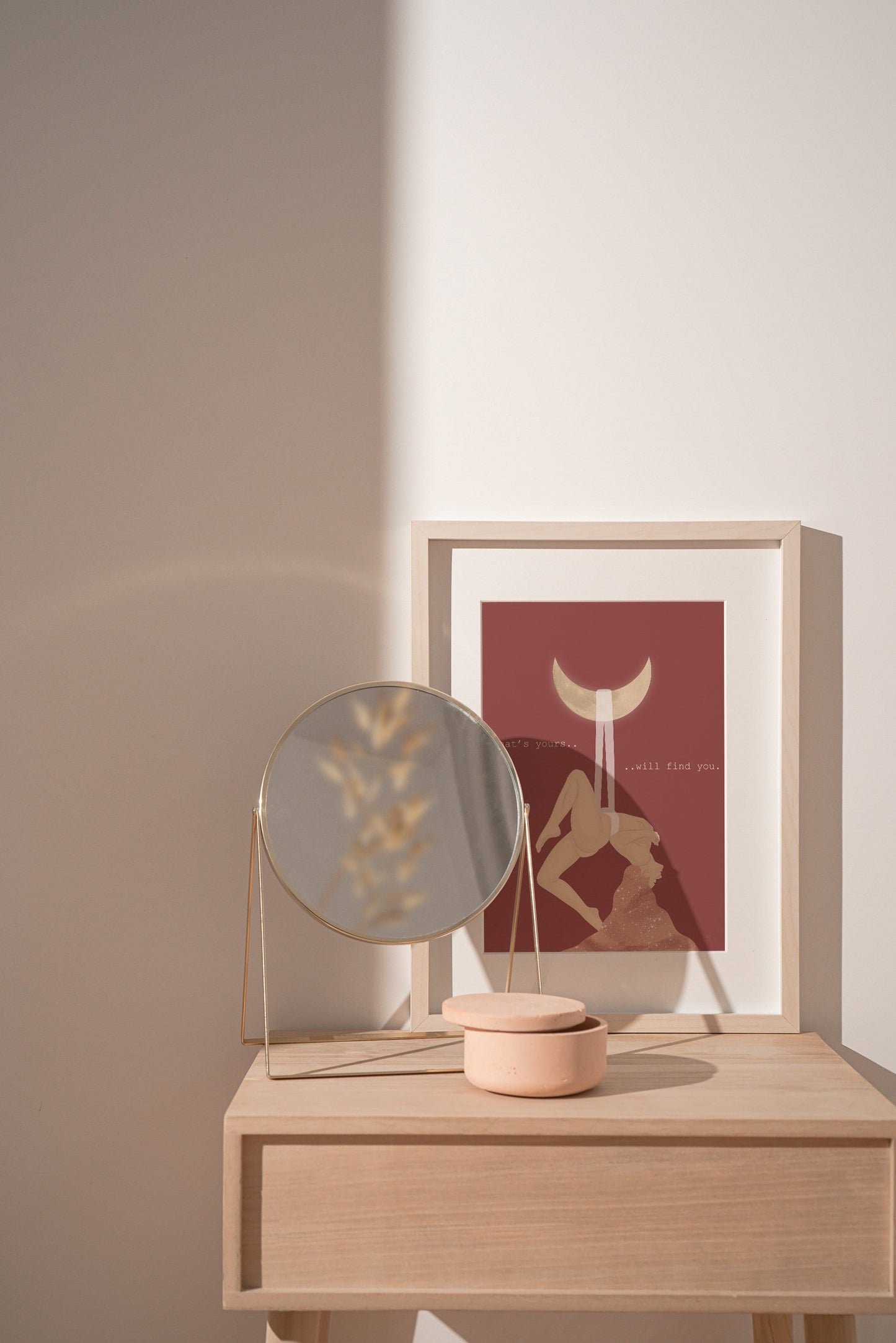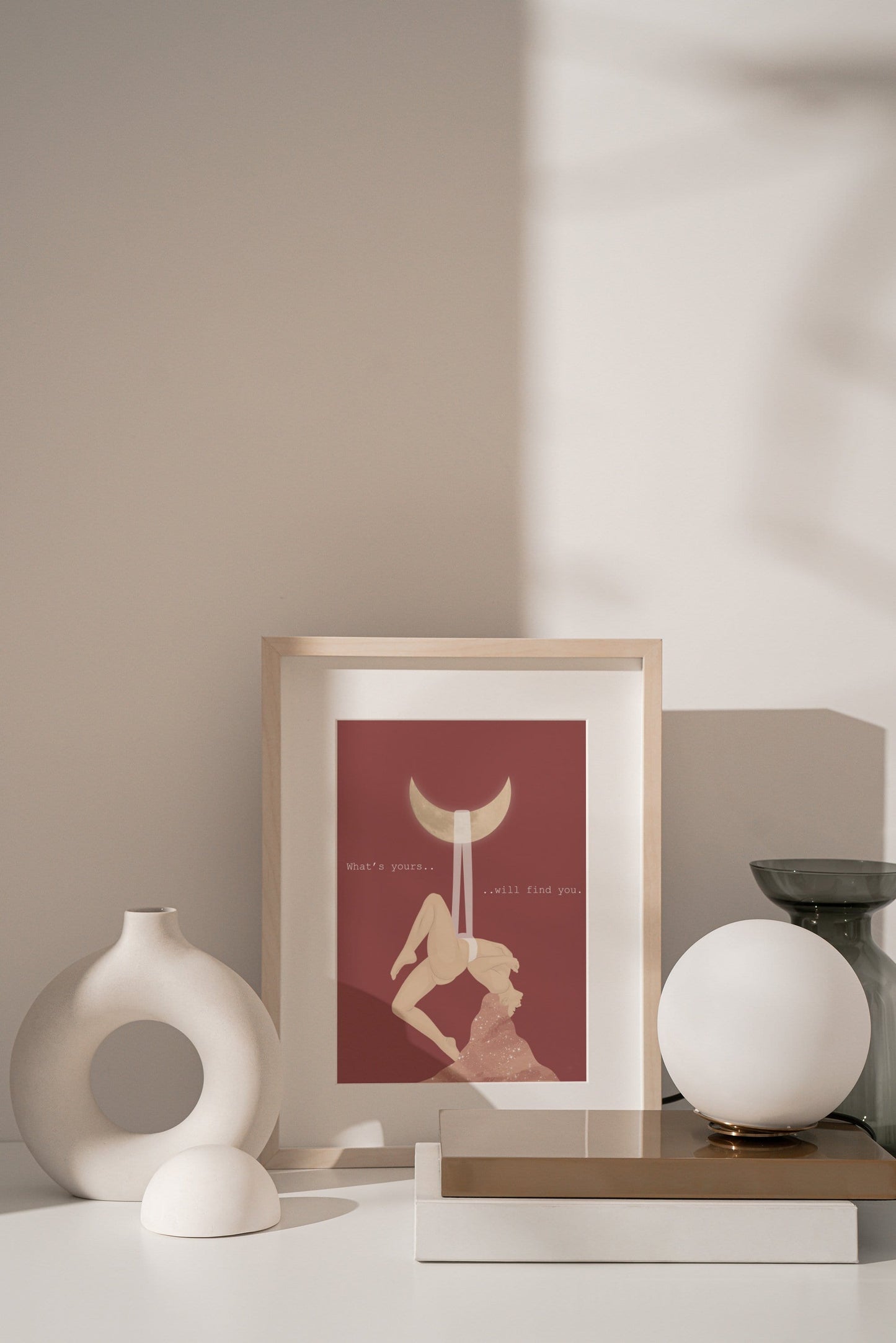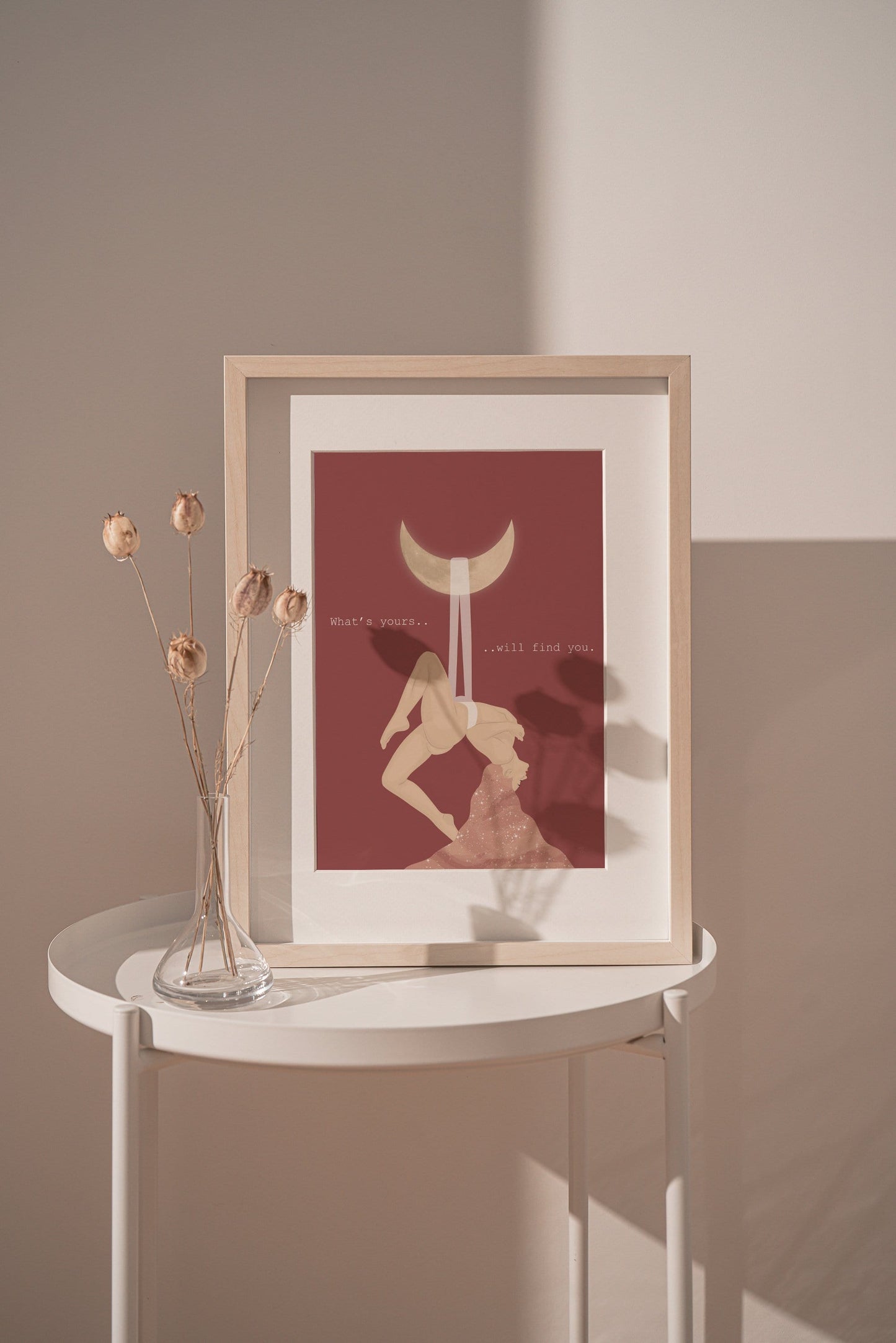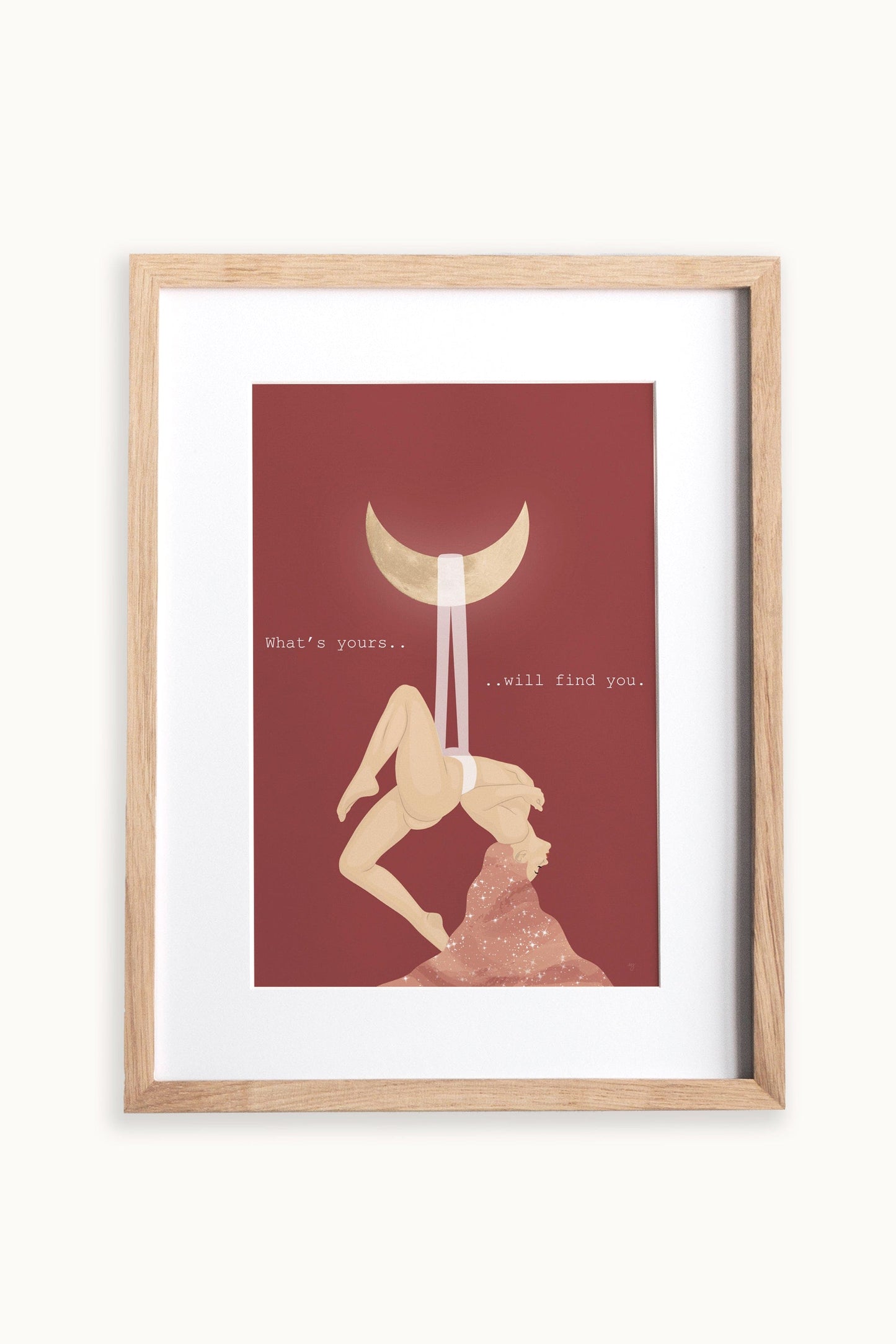 This spiritual and celestial illustration of a woman and the moon, with the quote "What's yours will find you" helps you embrace the divine feeling of connection with the universe.