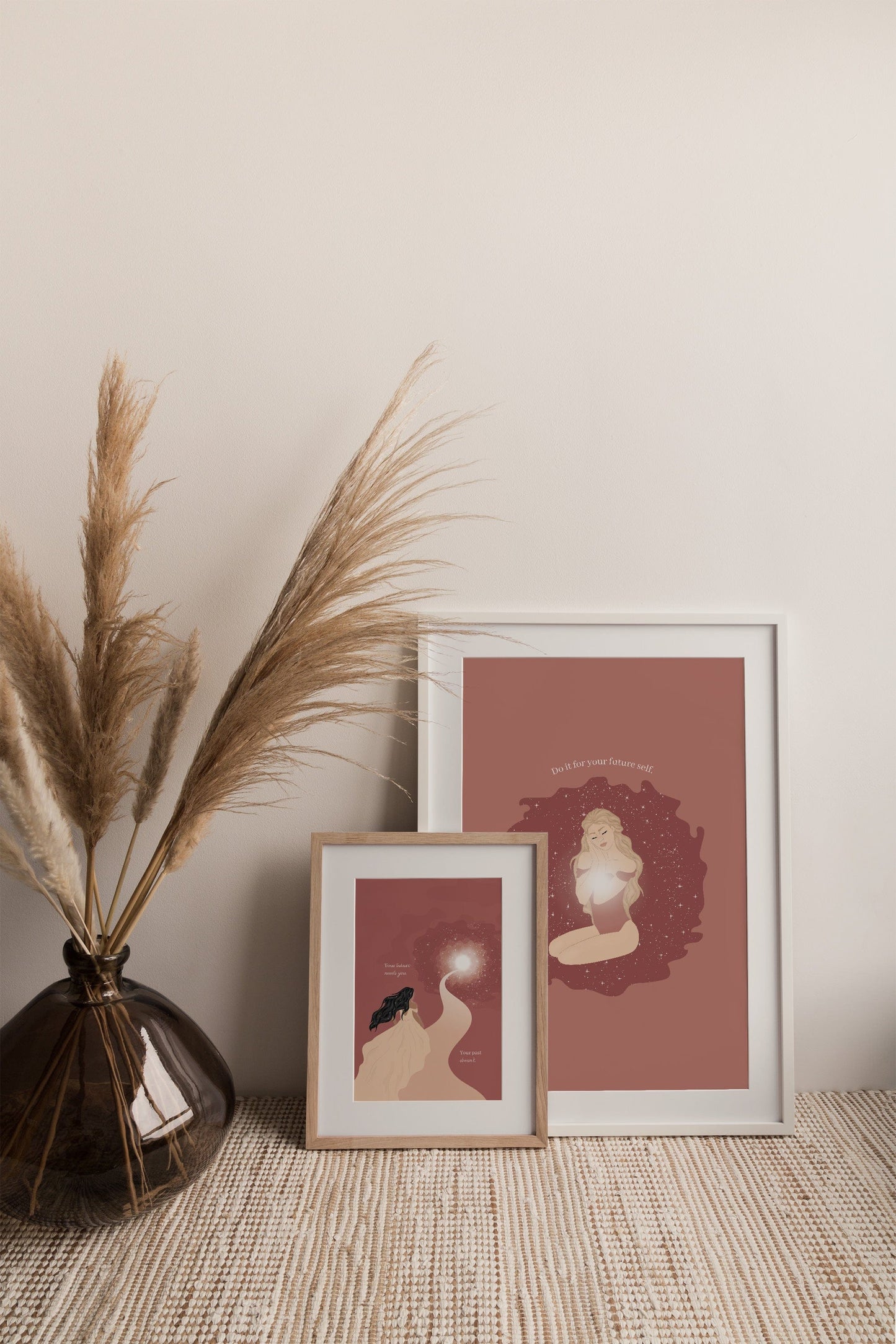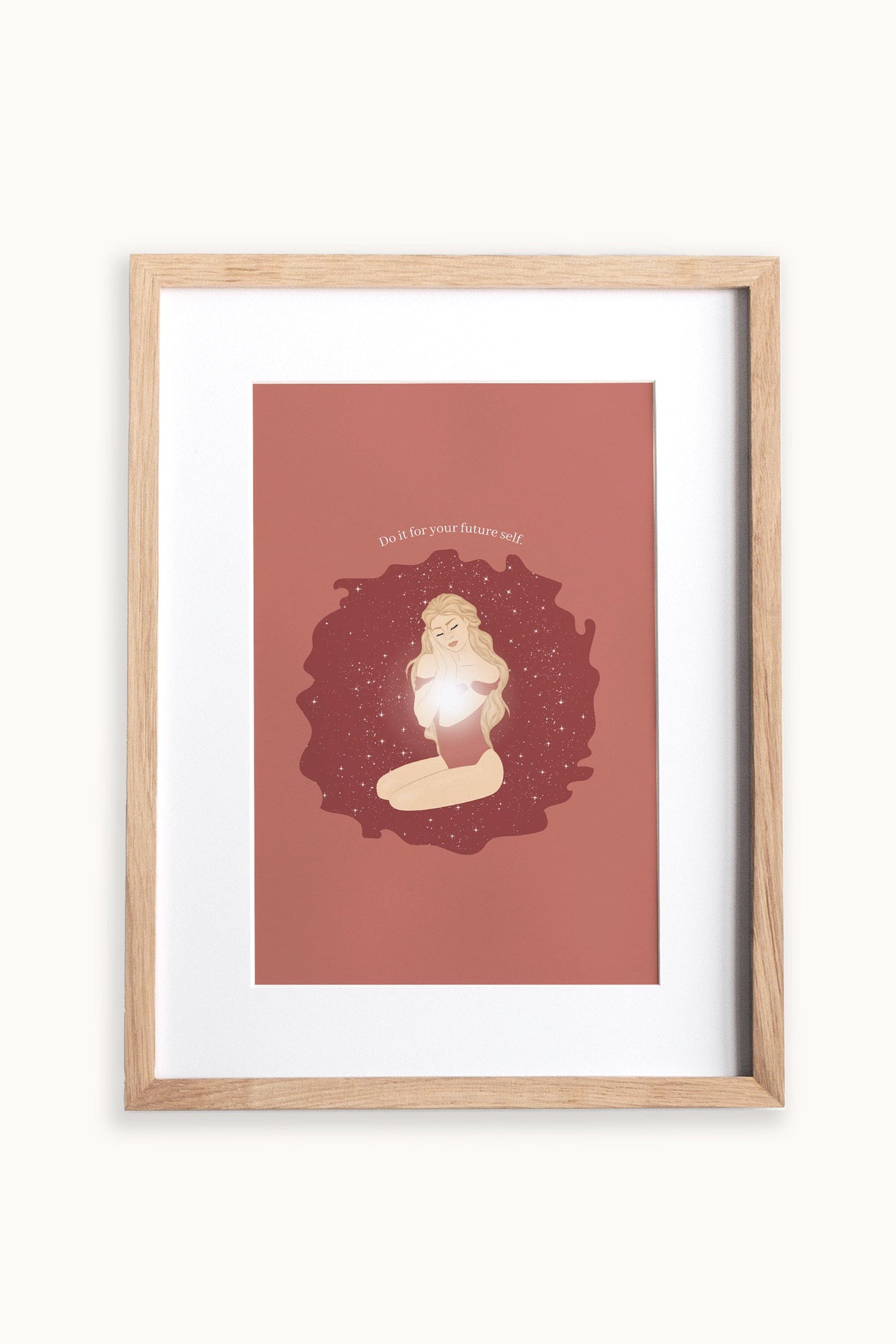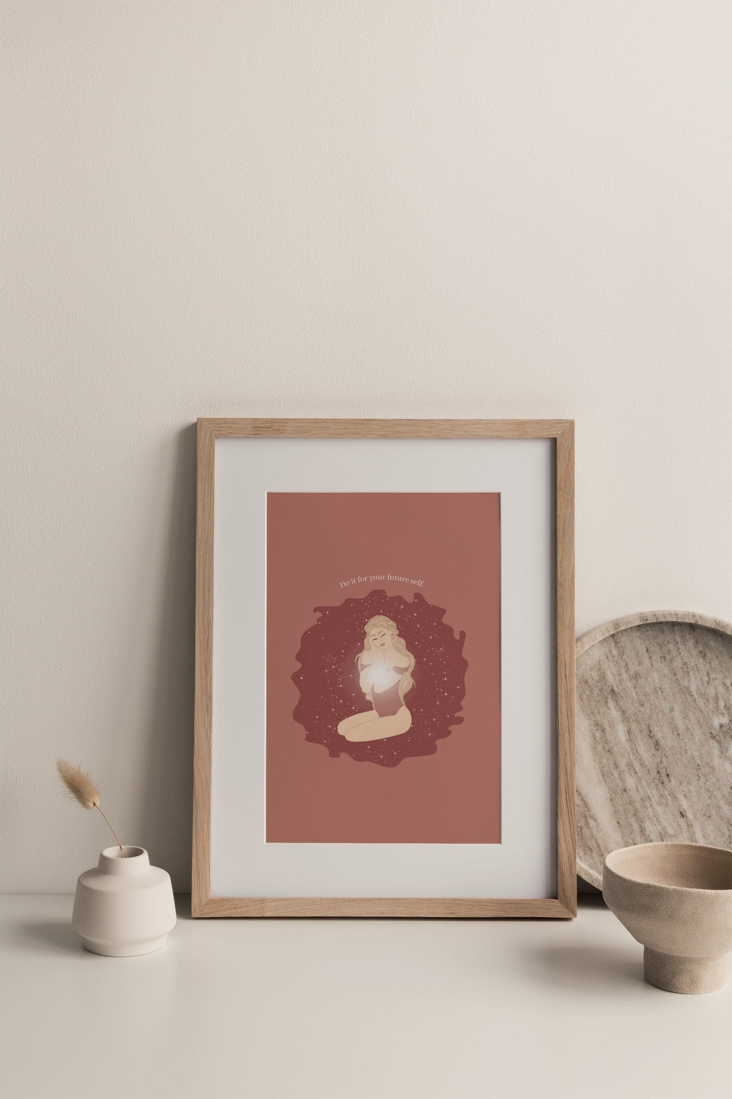 This spiritual and celestial illustration of a woman and the quote "Do it for your future self" helps you embrace the divine feeling of self love and female empowerment.